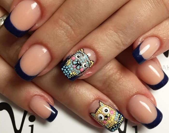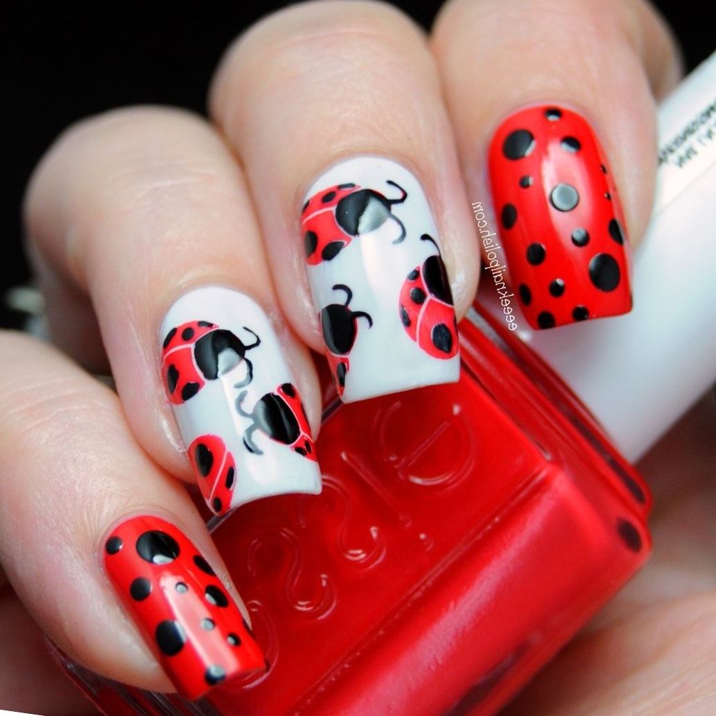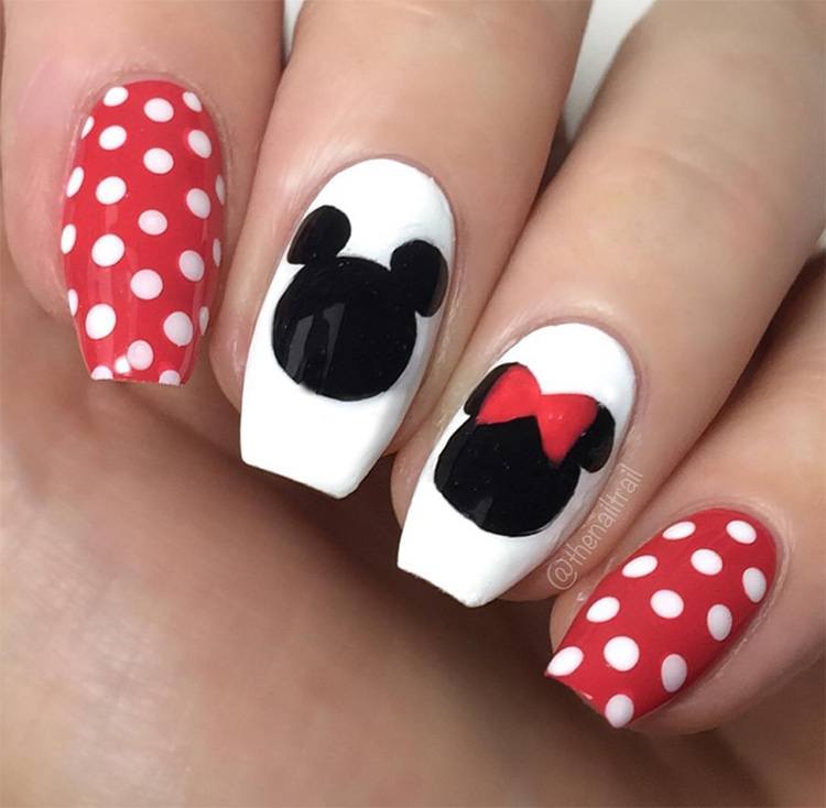 La combinaison de points avec un dessin et des motifs complexes est très jolie et attrayante.Une manucure à pois est déjà belle comme manucure indépendante et, associée à une photo, elle acquiert un design chic et une apparence attrayante. Par exemple, dessiner une coccinelle, de petits arcs, des cœurs ou un chat avec l'ajout de points unis ou colorés donnera aux ongles un dessin intéressant et original.
