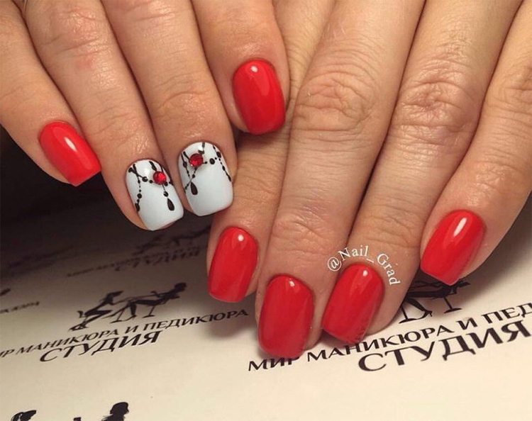 Aujourd'hui, une manucure aussi raffinée avec des compositions discrètes est populaire. L'utilisation de strass ou de pierres ne doit pas être volumineuse ni sursaturée. Une manucure est magnifique avec l'utilisation de strass ou de pierres au lieu de points sur un ou deux ongles.