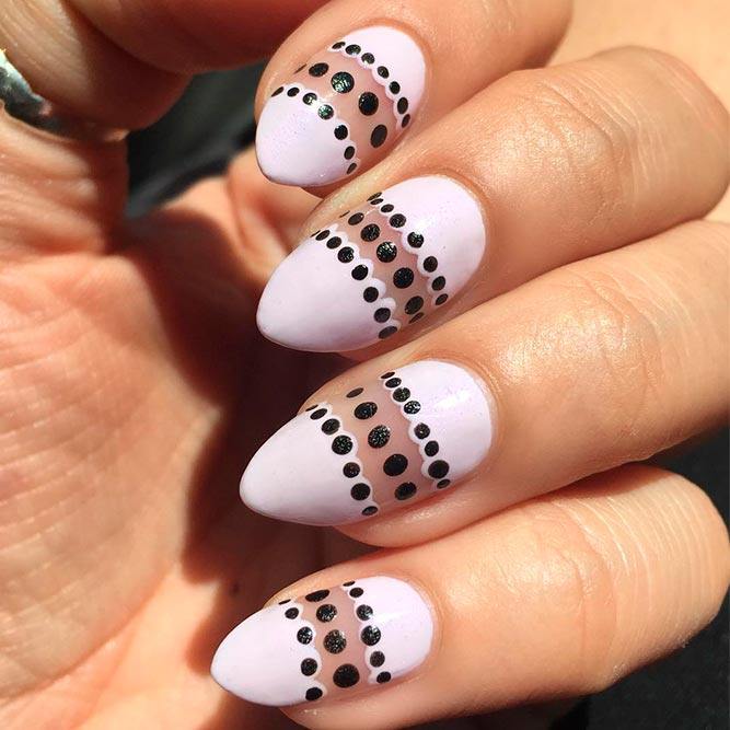 Une manucure à pois à l'allure harmonieuse et chic, complétée par un motif en dentelle. Les ornements en dentelle et les motifs à pois sont magnifiques en noir ou en blanc. Le motif et les pois en dentelle sont parfaits pour créer un mariage, une manucure en soirée. L’interprétation minimaliste d’un tel nail art a l’air chic et séduisant.
