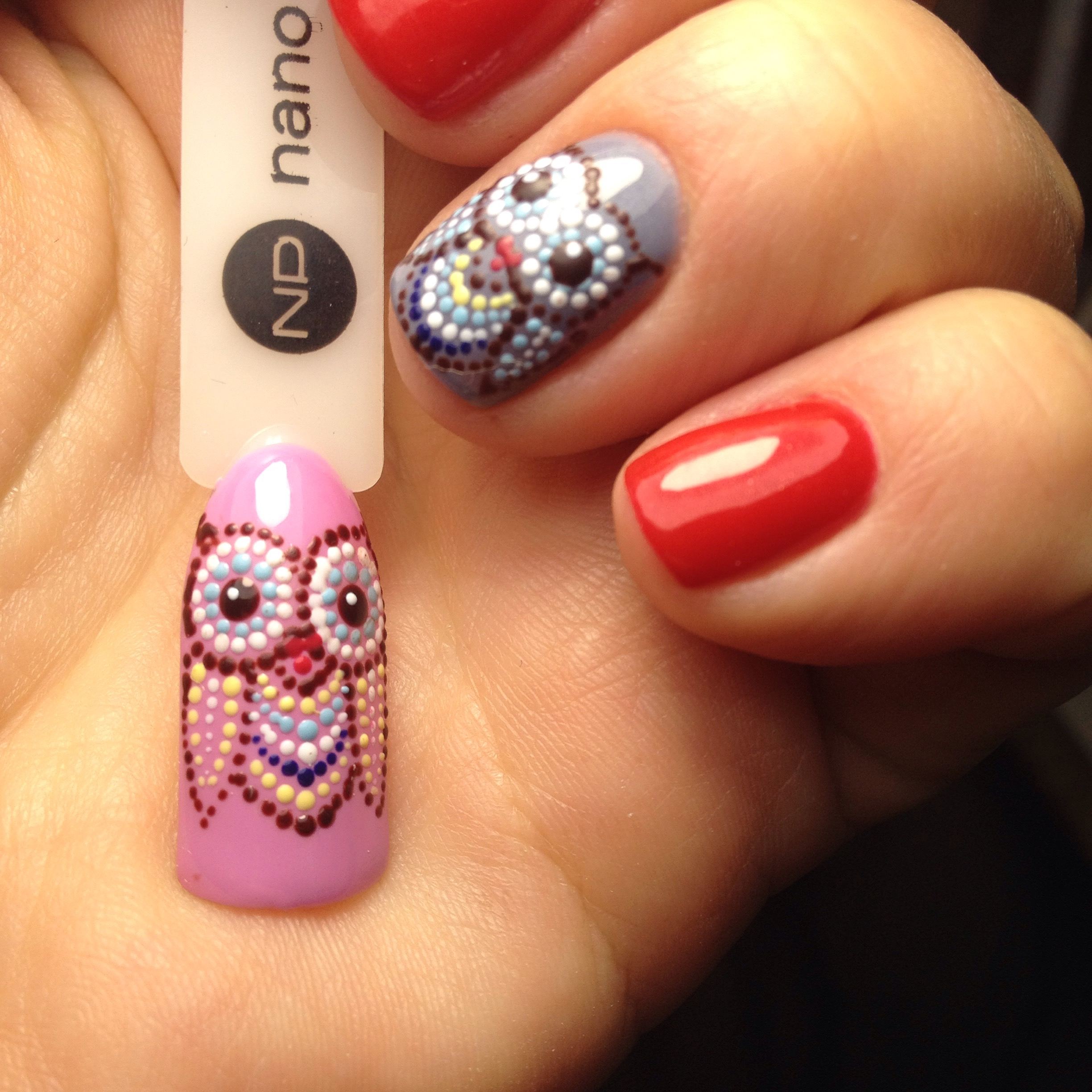 Manucure en pointillé avec un design et des motifs complexes.