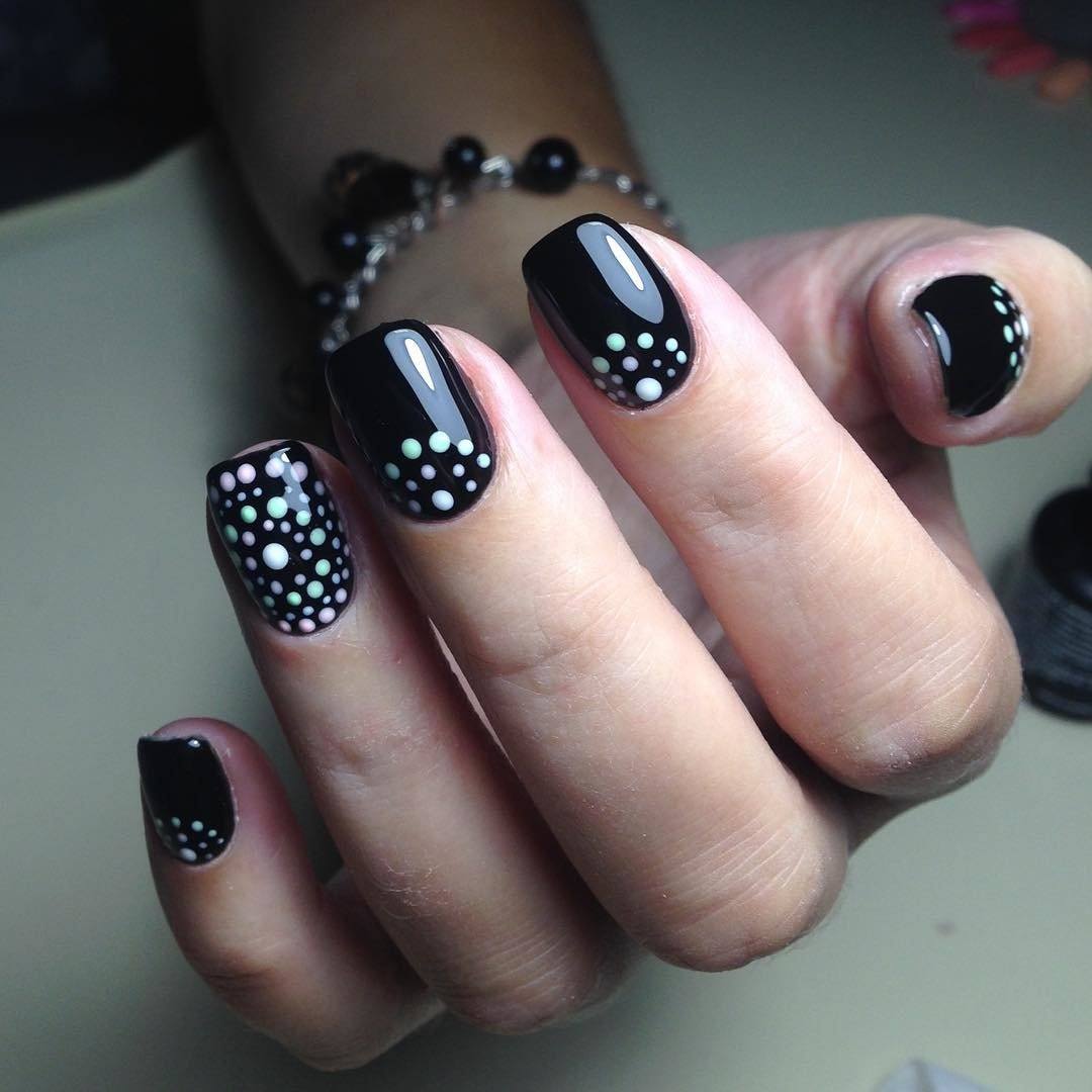Aujourd'hui, la manucure à pois en noir et blanc est considérée comme la plus tendance et la plus lumineuse. De plus, les points de ces couleurs sont en parfaite harmonie avec toutes les couleurs. Une manucure à pois avec une base de couleurs pastel sera magnifique et douce. De plus, des points blancs sur une palette plus foncée rendront la manucure attrayante et élégante. Superbe combinaison de pois noirs et blancs et de turquoise, rouge, rose, violet et jaune. En d’autres termes, le choix de la couleur dépendra de votre désir et de l’image que vous créez. Les points en noir et blanc ne peuvent être que partiellement réalisés et ont un design complexe avec une finition monochrome, multicolore ou brillante.