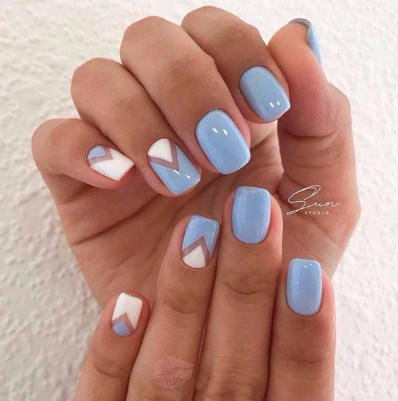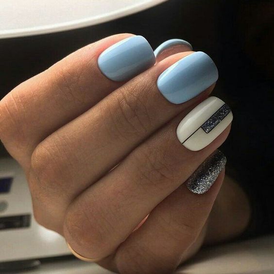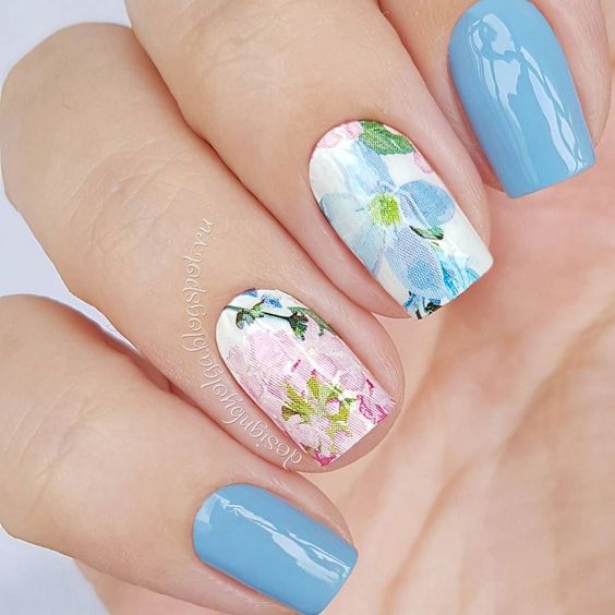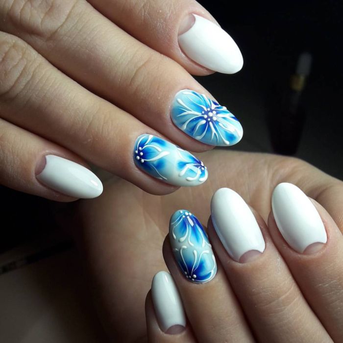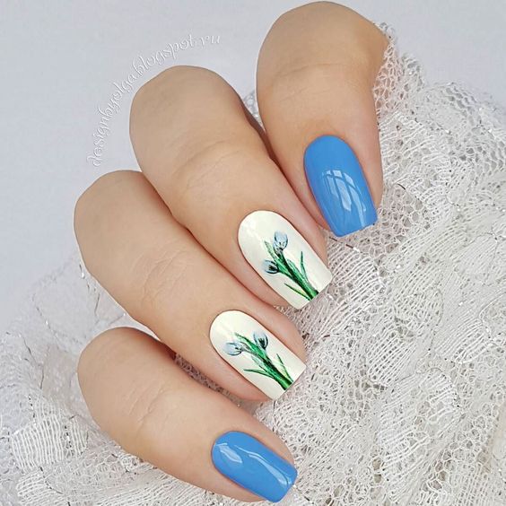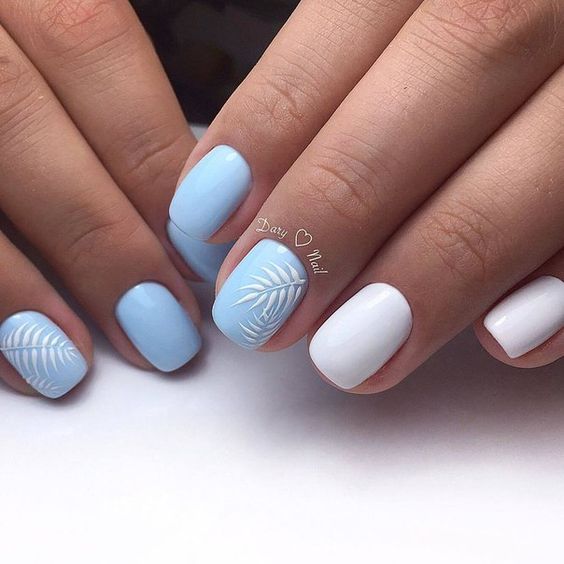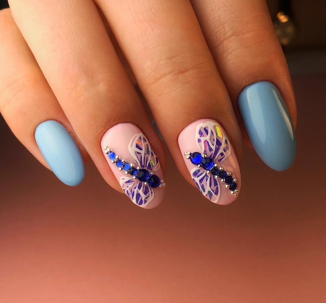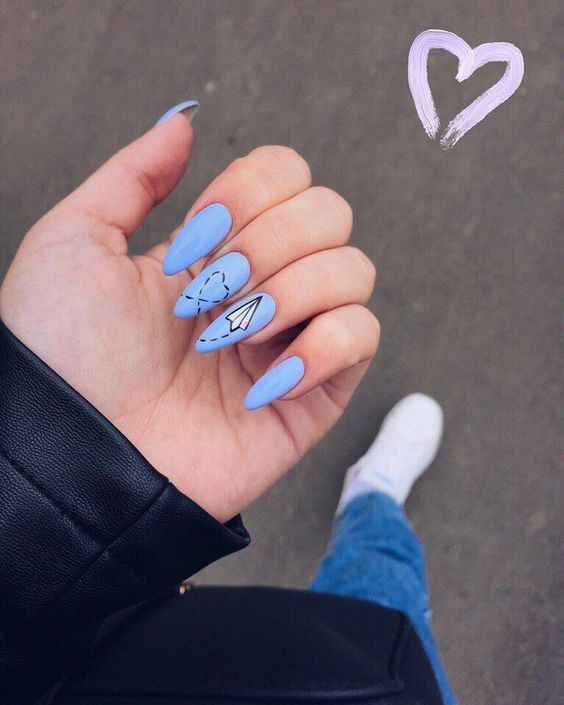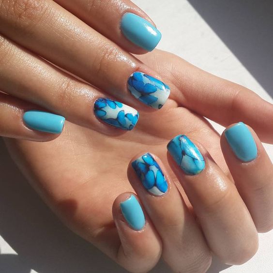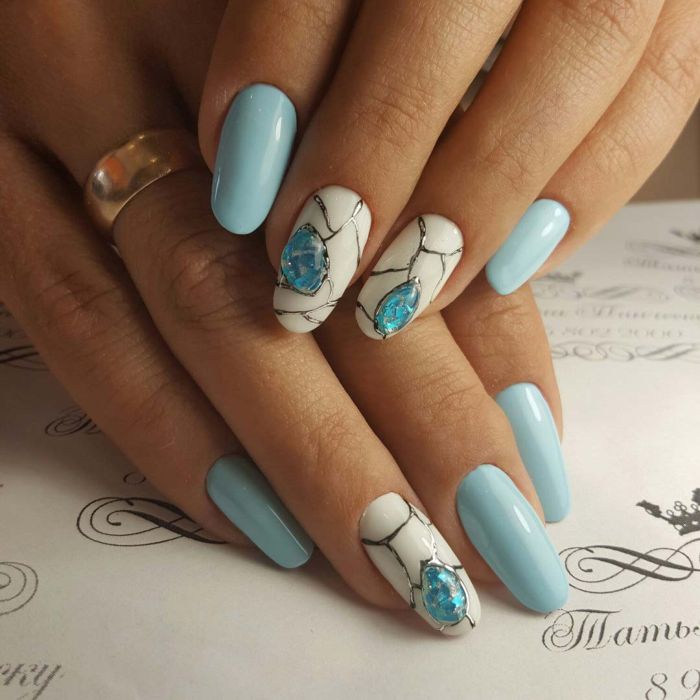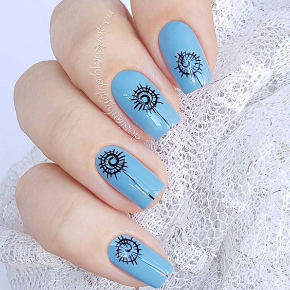 Et bien sûr, dessiner sur les ongles est toujours vrai. Qu'il s'agisse d'un petit motif ou d'une idée plus complexe, cela a toujours l'air attrayant. De plus, le bleu est une excellente option pour créer un fond sur les ongles.