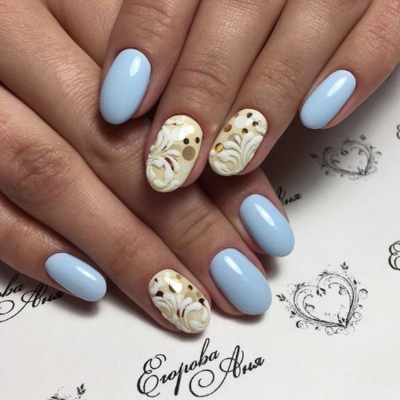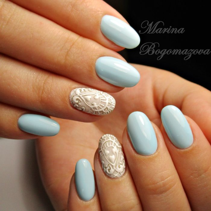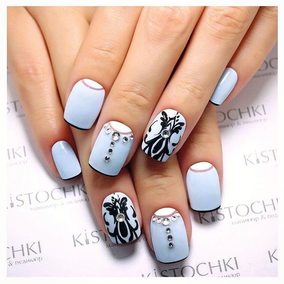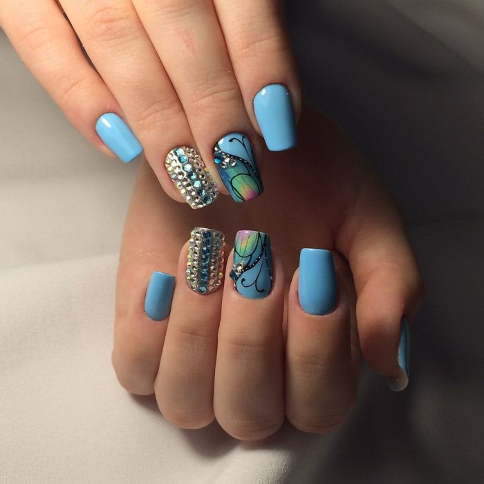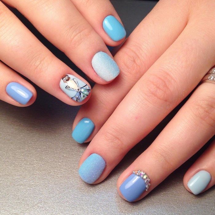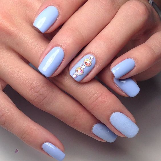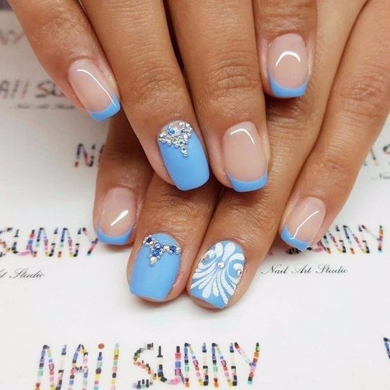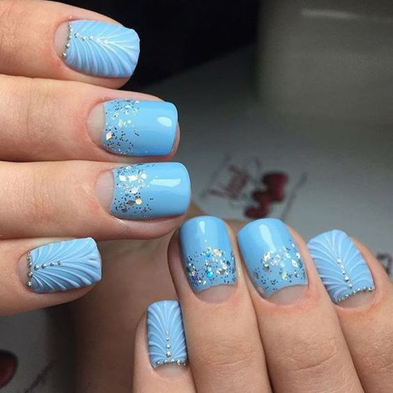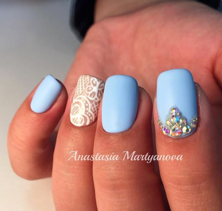 Puisque la couleur bleue elle-même est très délicate et calme, elle est souvent choisie pour un revêtement monophonique. Si vous le souhaitez, il peut être complété par diverses perles et strass pour rendre le dessin un peu plus spectaculaire.