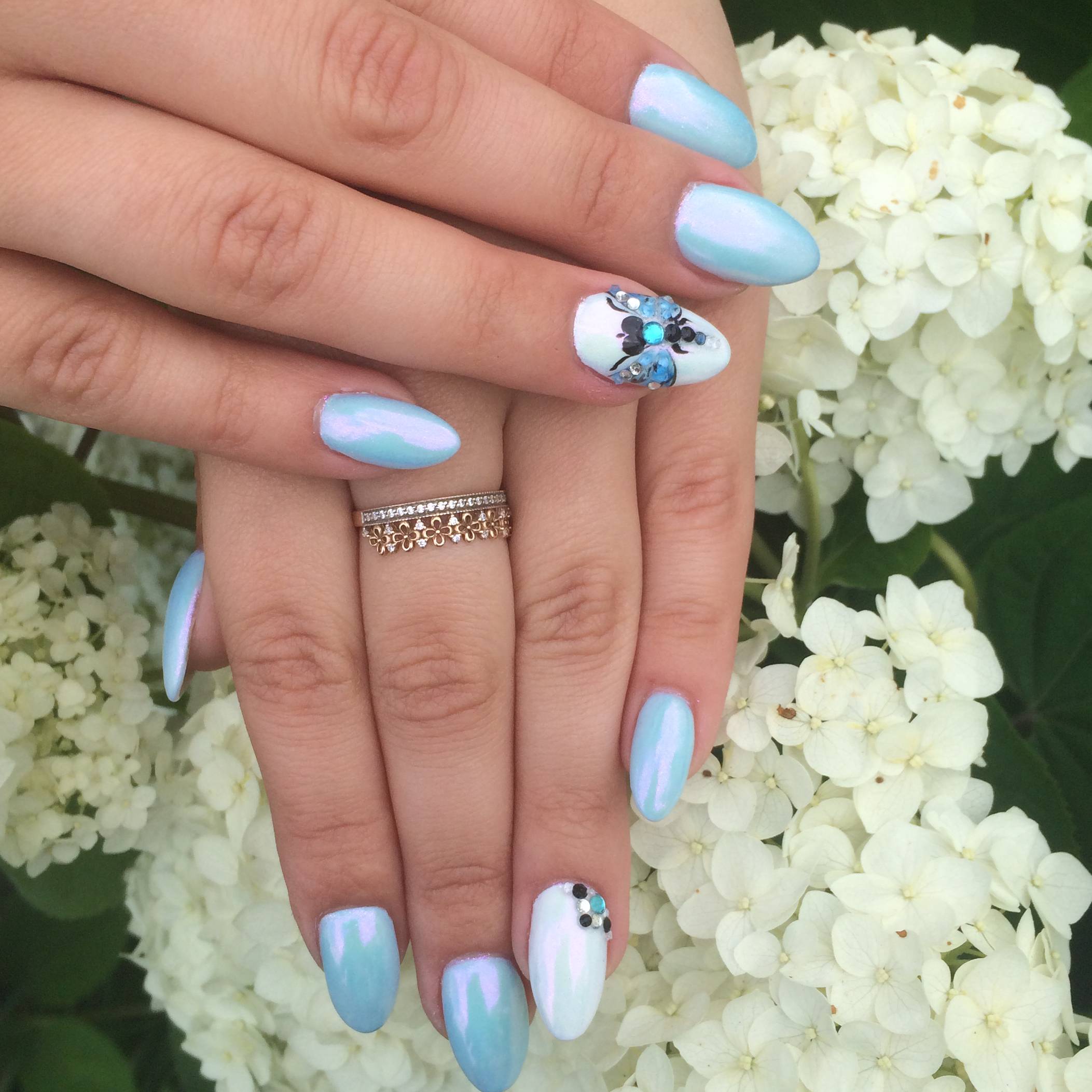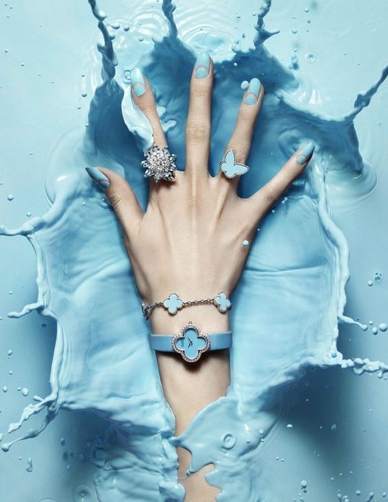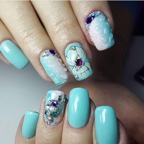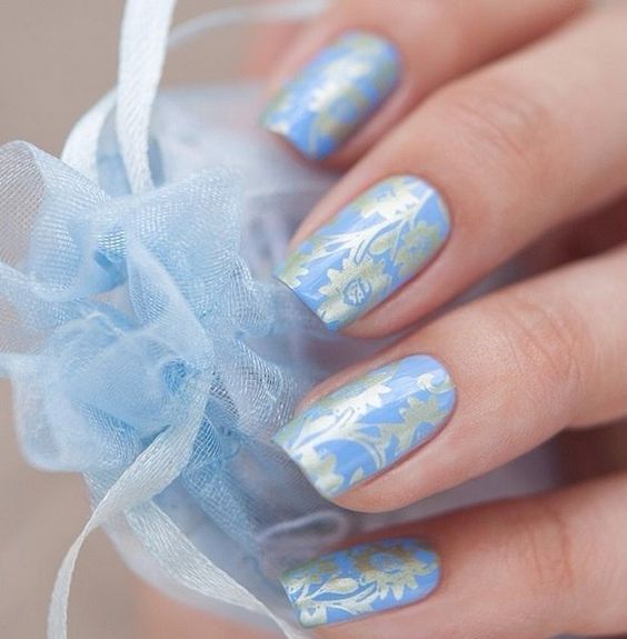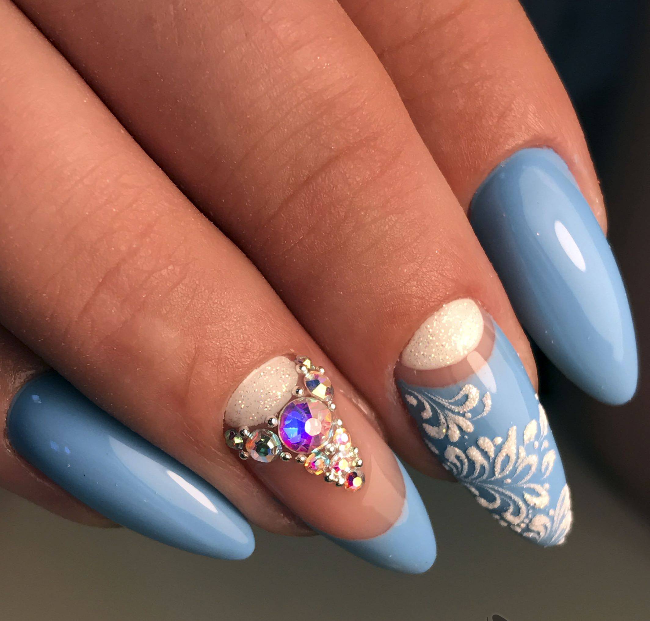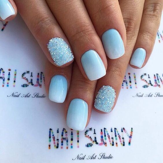 Puisque la couleur bleue elle-même est très délicate et calme, elle est souvent choisie pour un revêtement monophonique. Si vous le souhaitez, il peut être complété par diverses perles et strass pour rendre le dessin un peu plus spectaculaire.