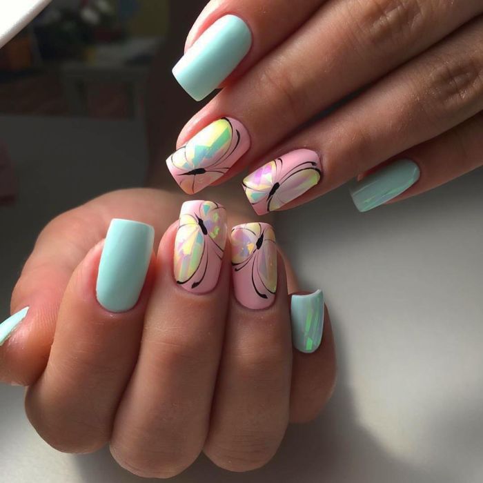 Encore plus légers, les motifs printemps-été restent pertinents. Délicats motifs floraux comme beaucoup de filles. Ce n'est pas surprenant, car une telle manucure sera une excellente décoration de votre image. Pas moins attrayante est l'image sous la forme de papillons. Le design dans ce style est une véritable incarnation de légèreté et de féminité.