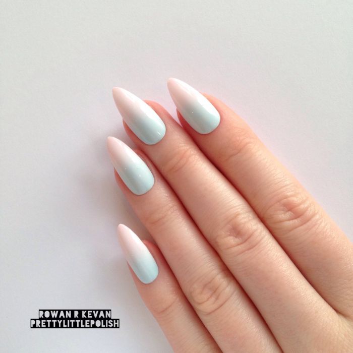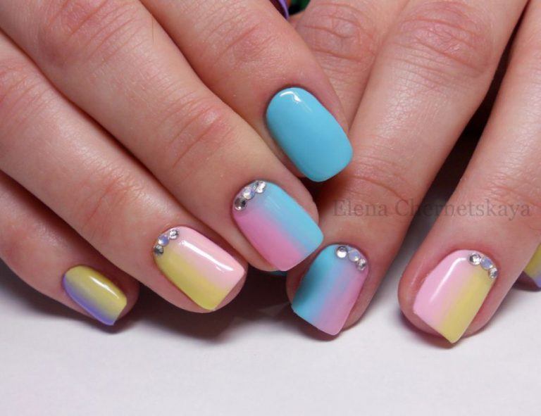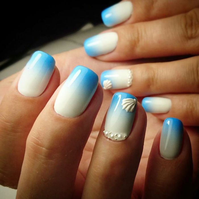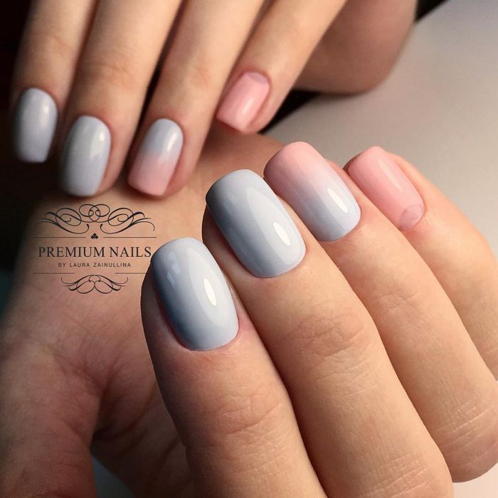 L'effet ou dégradé d'ombre a longtemps été populaire et occupe donc une position dominante en 2026. Ce n'est pas surprenant, car une telle manucure peut être faite à la fois d'été léger, presque invisible et plus vivant. Tout dépend des nuances à combiner. Par exemple, une combinaison de bleu clair et de beige est toujours aussi naturelle que possible. À leur tour, des tons bleus et roses plus saturés sont parfaits pour créer un design dynamique.