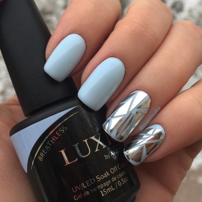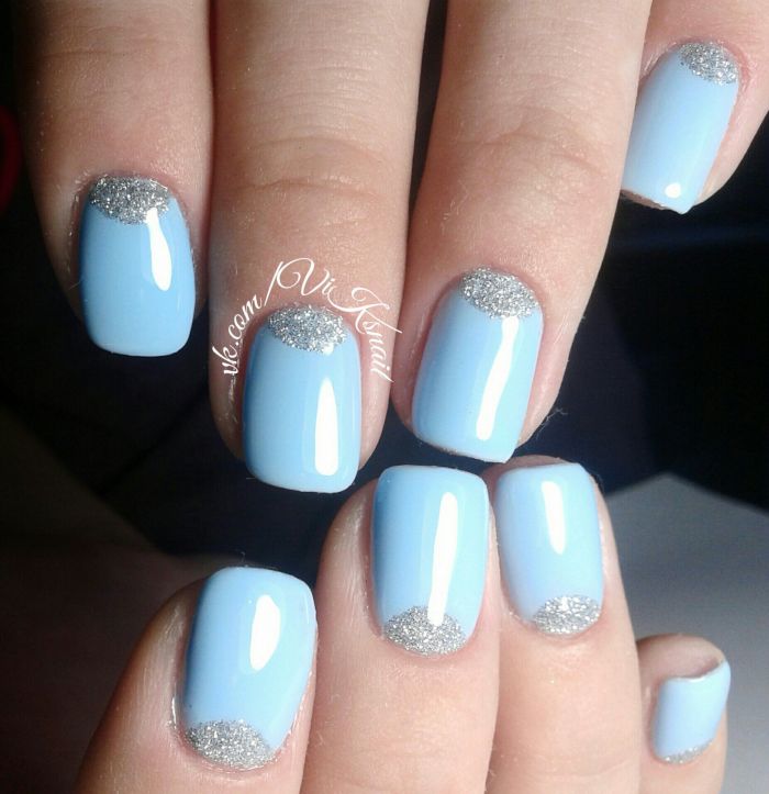 Malgré la grande popularité du design classique, vous souhaitez parfois lui ajouter de la variété et des détails intéressants. Dans ce cas, vous pouvez simplement changer la nuance en bleu. Pour cette raison, il aura l'air complètement différent. En outre, une telle manucure ajoutera une touche de tendresse et de féminité à votre image. Soit dit en passant, malgré une exécution non standard, cette conception convient même pour le travail de bureau.