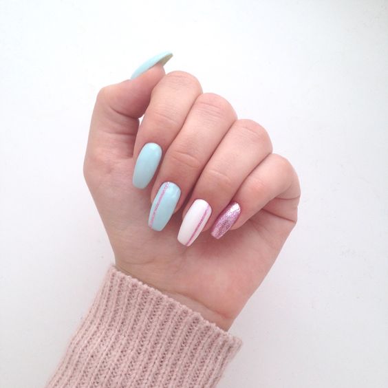 Pour ceux qui n'aiment pas les motifs trop intenses et les éléments décoratifs complexes, nous recommandons l'utilisation de paillettes. Avec son aide, vous pouvez transformer un revêtement monophonique et le rendre plus festif et lumineux. À la maison, vous pouvez utiliser du vernis à paillettes pour cela. Chacune des options a l'air vraiment cool.