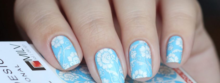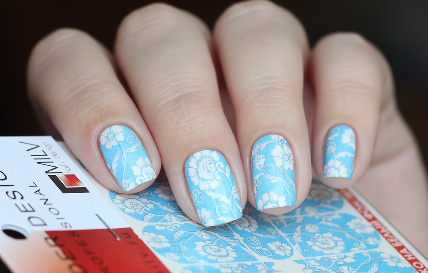 Vous pouvez faire une conception similaire de soucis à la maison. Pour ce faire, vous avez besoin d’un kit d’estampage spécial. Il se compose de vernis spéciaux, d’une plaque avec des dessins, d’un tampon et d’un grattoir. Son utilisation est très simple, mais avant d'appliquer sur les ongles, nous recommandons un peu de pratique. Donc, vous devez d’abord appliquer une couche de vernis sur les ongles et attendre qu’elle sèche complètement. Ensuite, appliquez un peu de vernis de couleur différente sur le motif sélectionné sur la plaque. Enlevez les restes avec un grattoir et transférez simplement le motif avec un tampon. Si vous le souhaitez, vous pouvez appliquer une couche de finition.