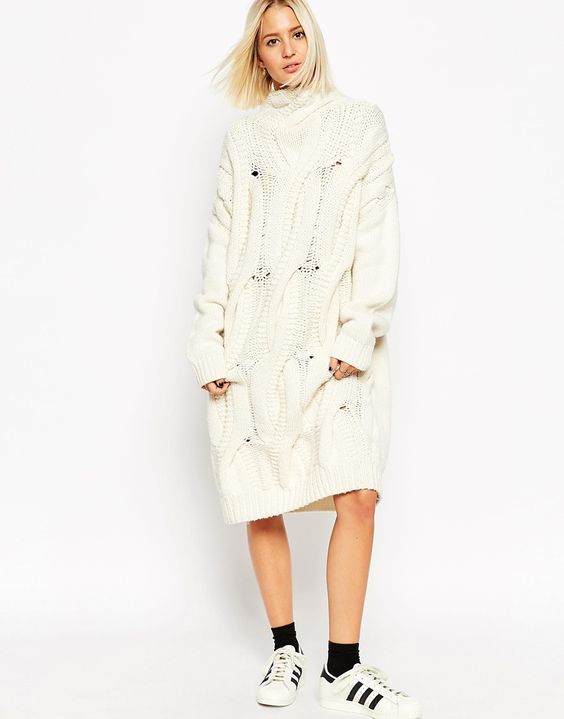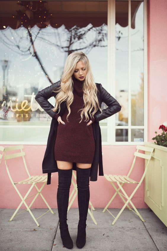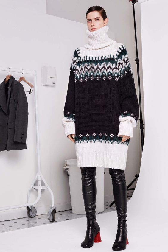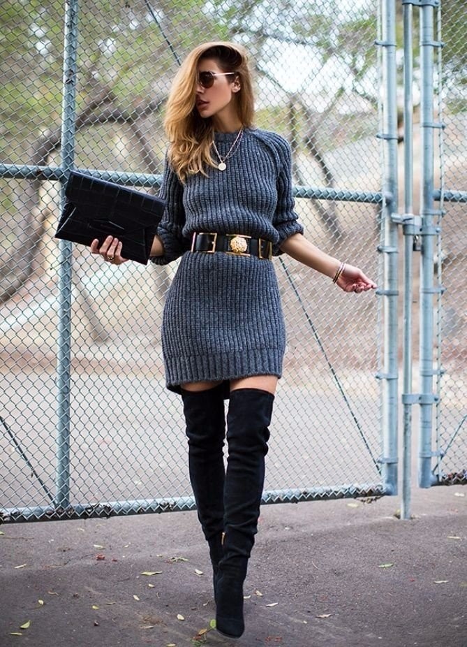 Pour ceux qui sont prêts pour des expériences de mode, nous proposons d’essayer un pull oversize allongé en guise de robe. Bien sûr, cela semble très inhabituel. Elles sont souvent associées à des bottes hautes sur le genou. Grâce à cela, l'image a l'air plus féminine.