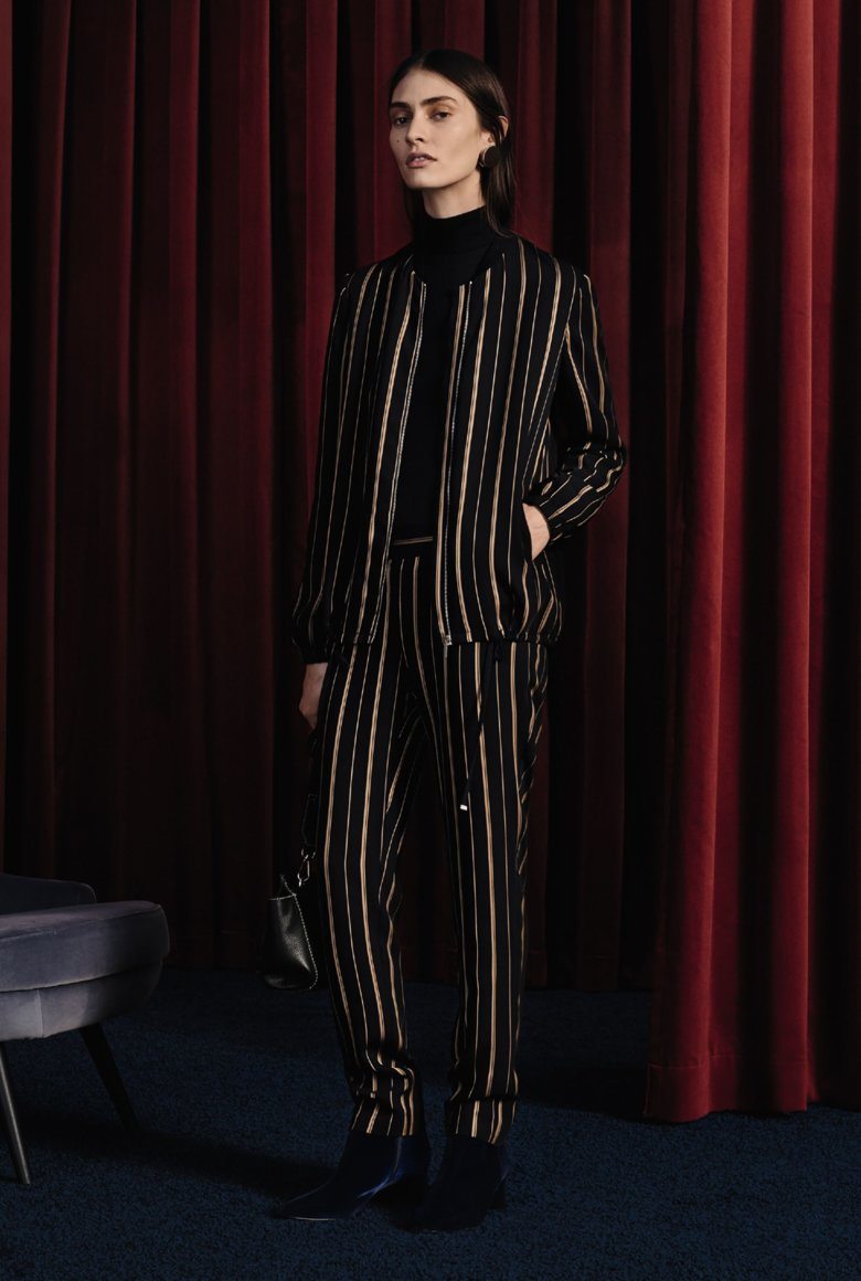 Un pantalon de créateur tendance en fines bandes bleu foncé des marques célèbres «BOSS» et «ISABEL MARANT» contribuera à créer un look élégant, dynamique et rajeunissant.