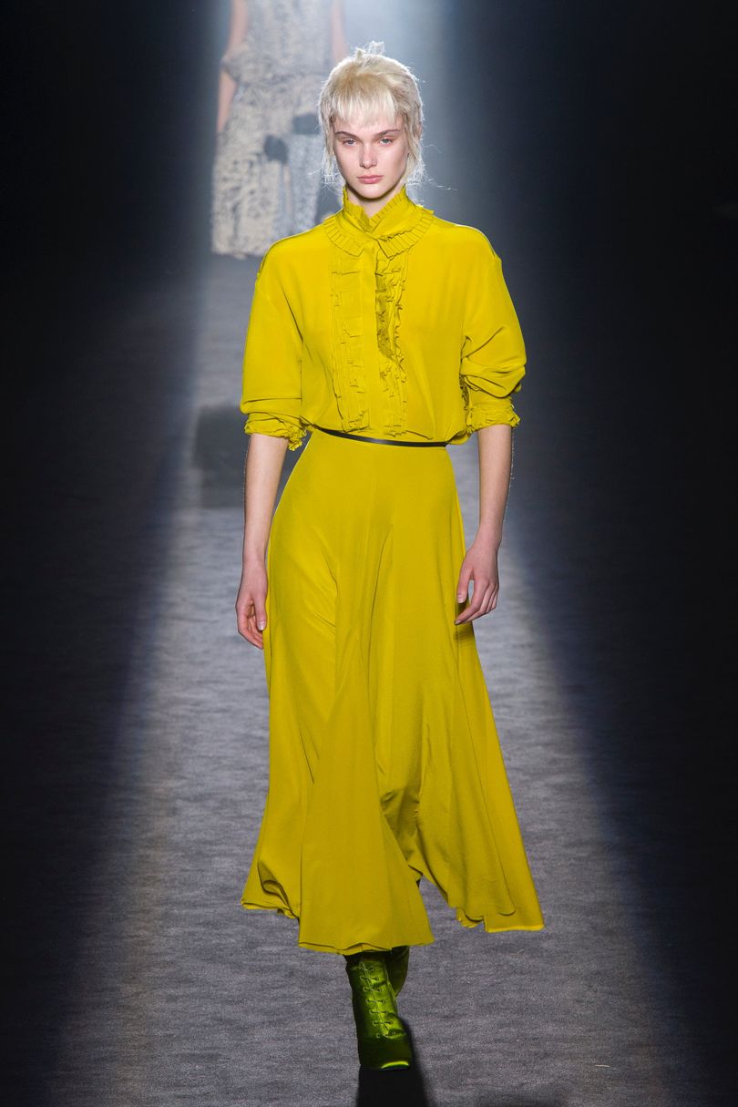 Et une autre nuance de jaune est la lumière de la rampe.Contrairement au jaune ordinaire, la lumière de la rampe se distingue par sa luminosité et, selon les experts de l'Institut Panton, est une couleur vive qui donne à la femme courage et luminosité.
