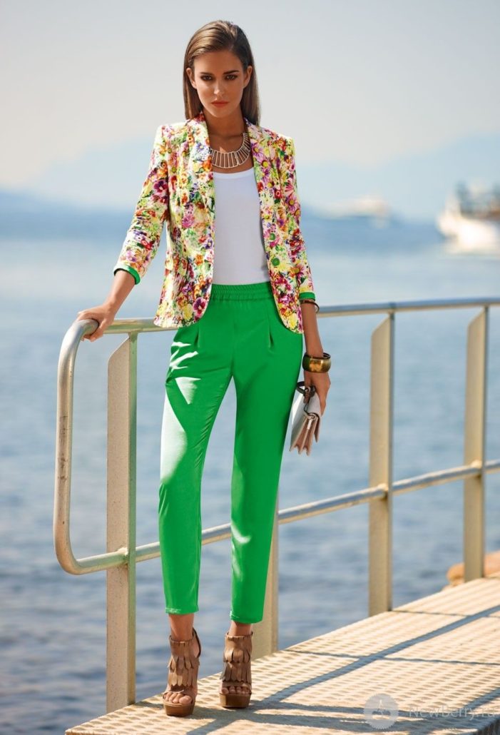 Dans l'image quotidienne du printemps-été 2026, les couleurs vives et printanières prévalent. Un pantalon de couleur pastel qui se marie bien avec un chemisier et un blazer a l'air frais.