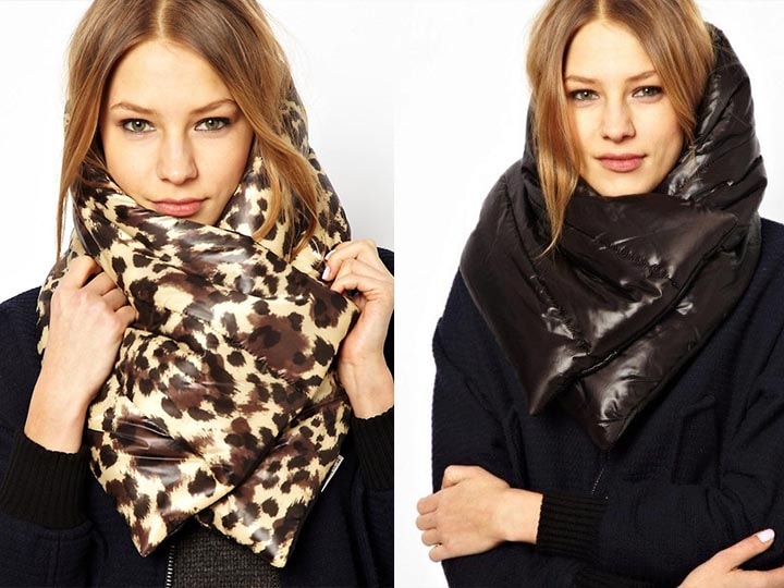 Les écharpes soufflées surdimensionnées sont très intéressantes. Ils ont la texture d'une veste en duvet et peuvent être lisses ou matelassés. Ces produits n'ont presque toujours pas de décor supplémentaire, mais vous pouvez les ajouter vous-même si vous le souhaitez.