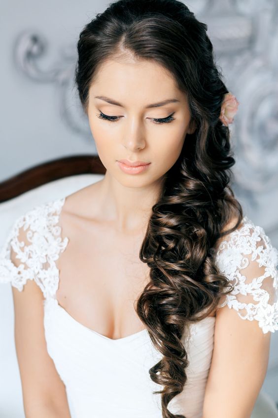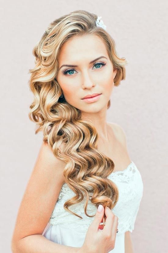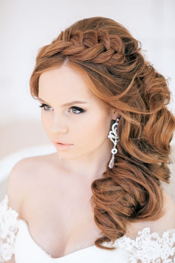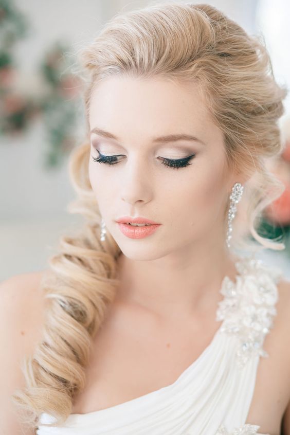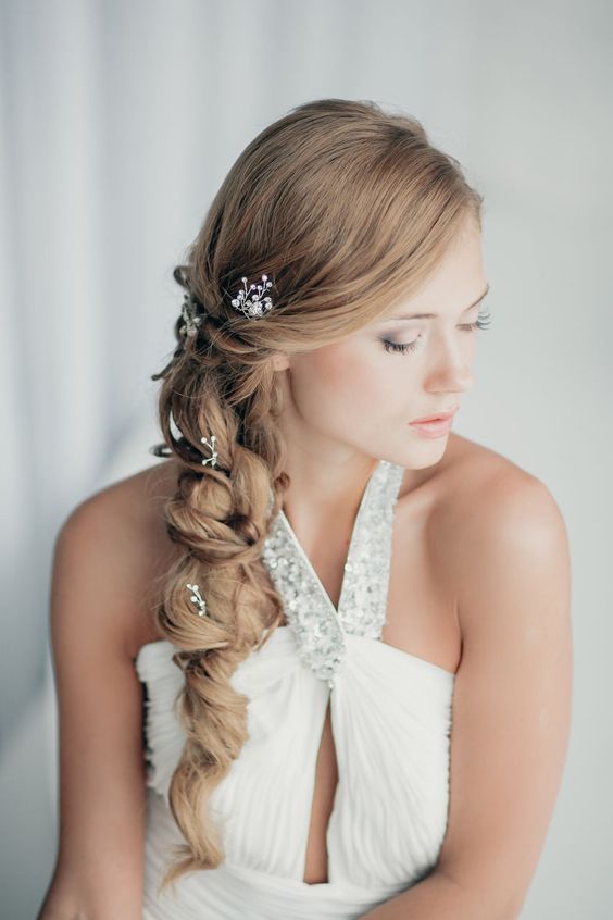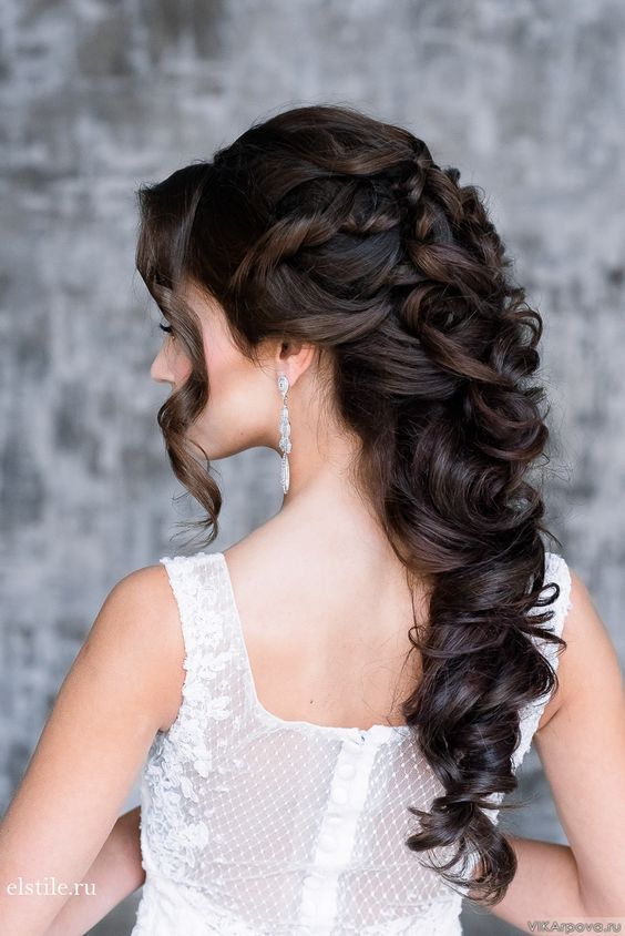Une autre variante non moins populaire de la coiffure de mariage est l'asymétrie. Souvent, il est fabriqué à partir de boucles ou d'une tresse très volumineuse. Cependant, contrairement à la coiffure classique, cela se fait d'un côté. Cette option est idéale pour celles qui choisissent pour elles-mêmes une robe classique ou avec un dos ouvert.