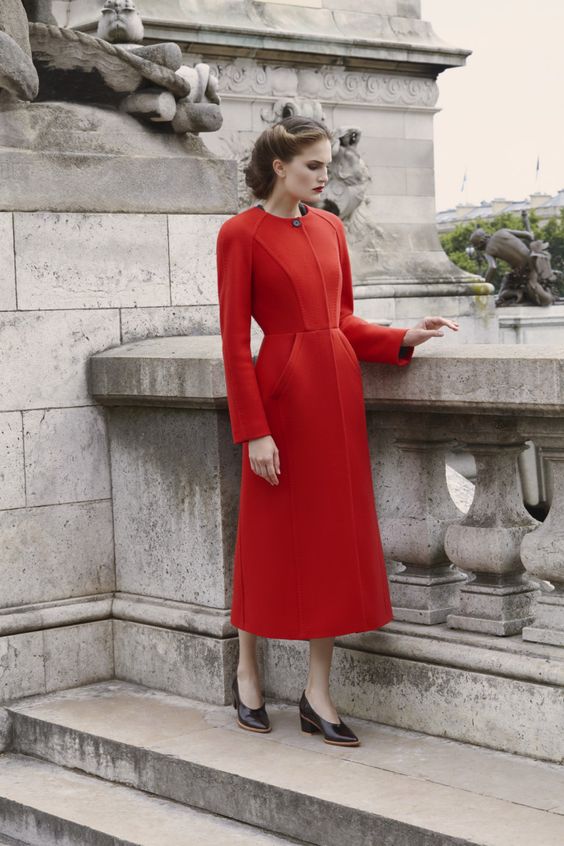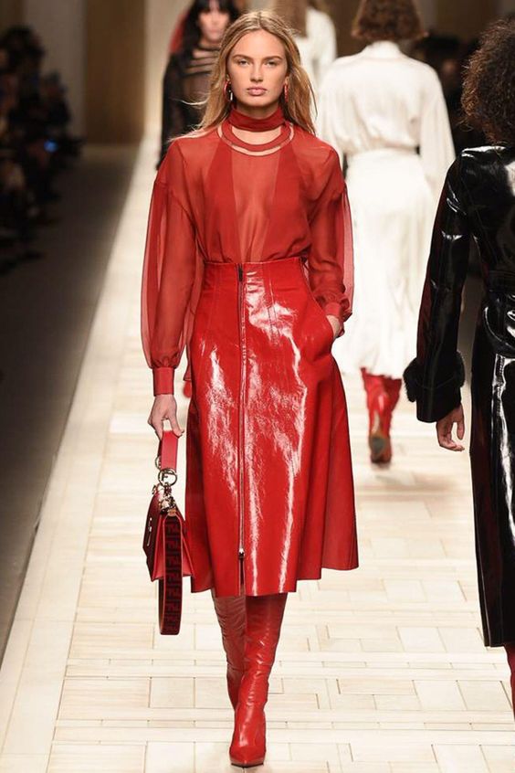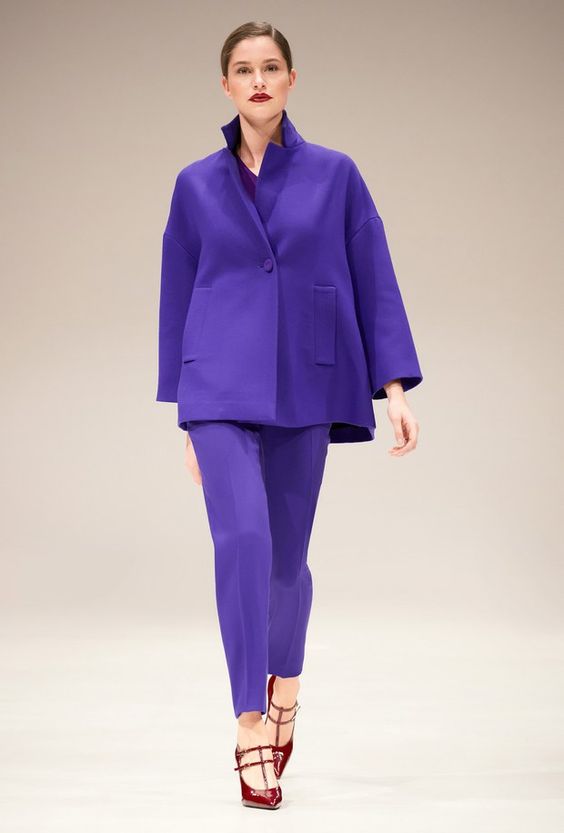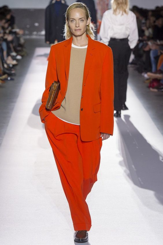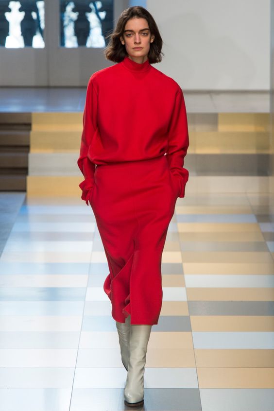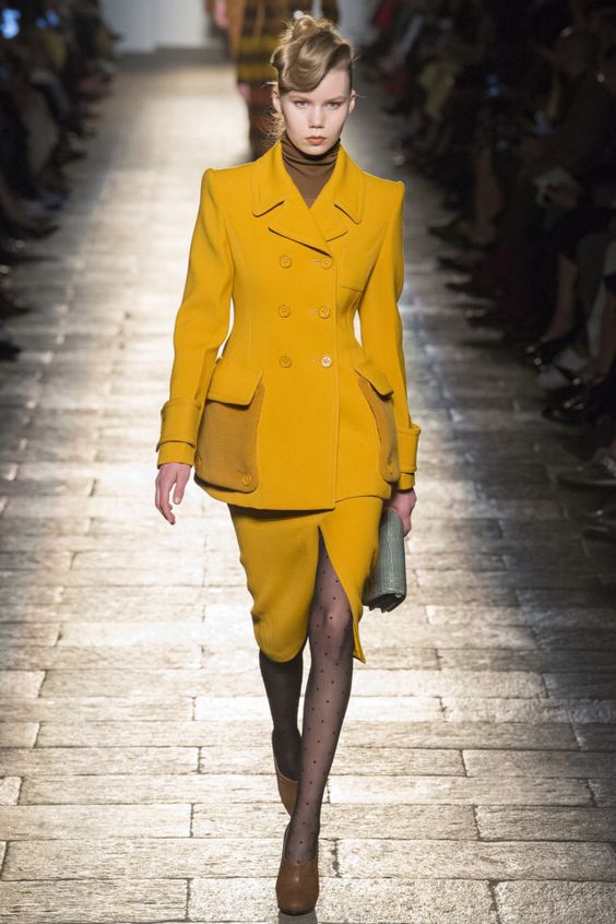 Il était impossible de ne pas remarquer des couleurs vives dans les vêtements. Ceux-ci incluent le rouge et le jaune. Ils ont l’air vif, juteux et parfaits pour l’automne. Si vous n'avez pas peur d'être à l'honneur, achetez des manteaux, des costumes ou des robes de cette couleur. Plus les filles modestes regardent mieux les chaussures et les accessoires brillants.