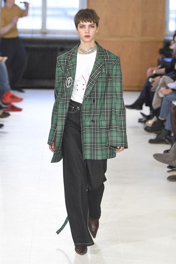 Les costumes surdimensionnés seront tout aussi populaires. Ils ont l'air très intéressant, un peu lâche et détendu. En ce qui concerne le tissu, on peut utiliser non seulement le tissu de costume habituel pour la couture, mais aussi le tweed ou même la laine. Dans le même temps, vous pouvez les combiner avec des blouses, des t-shirts et même des hauts.
