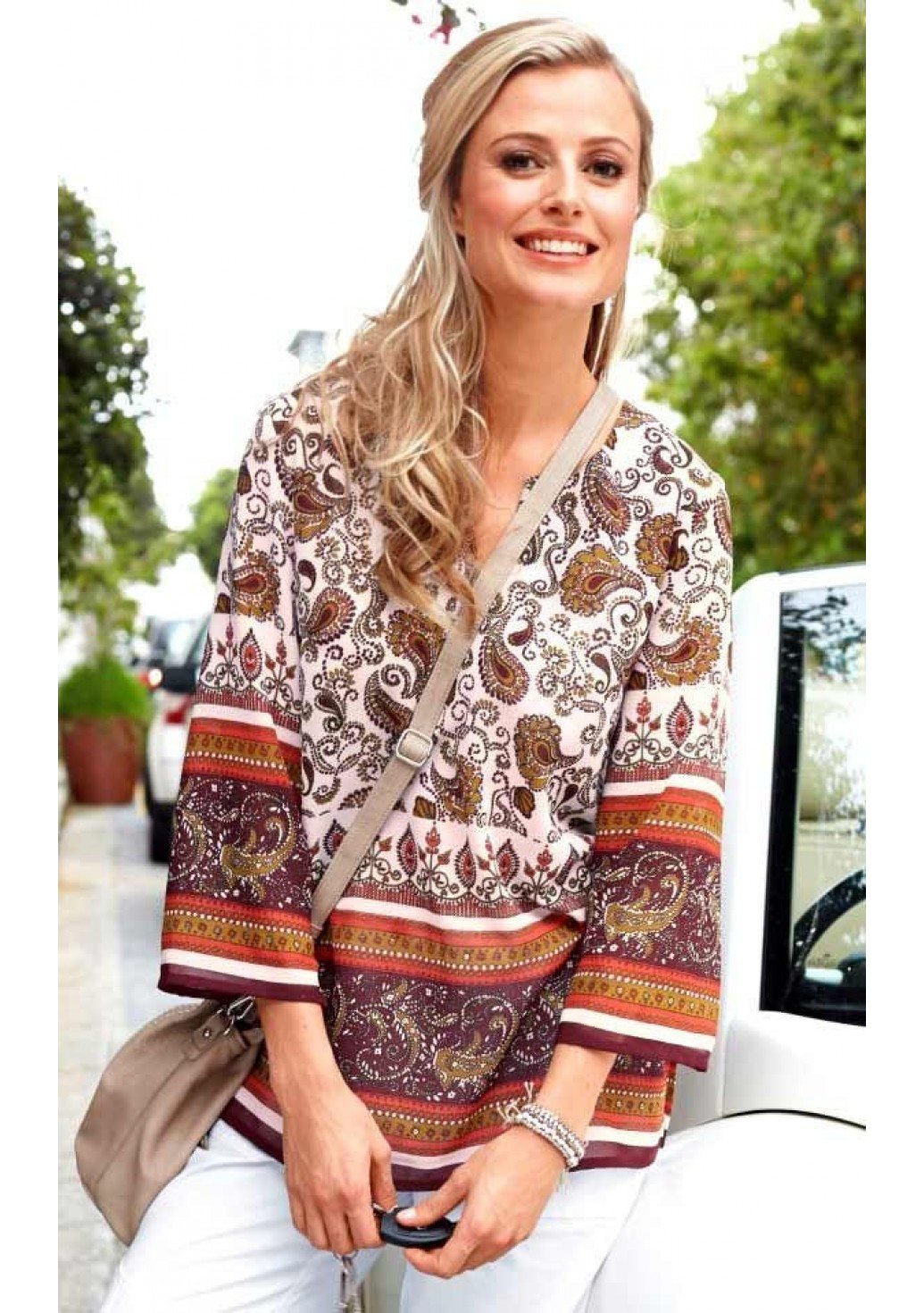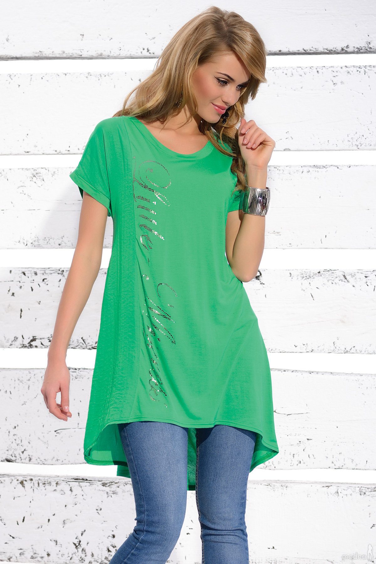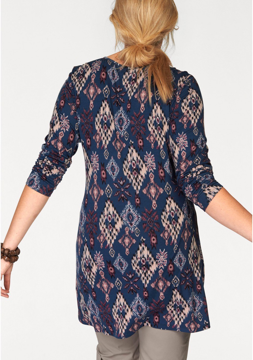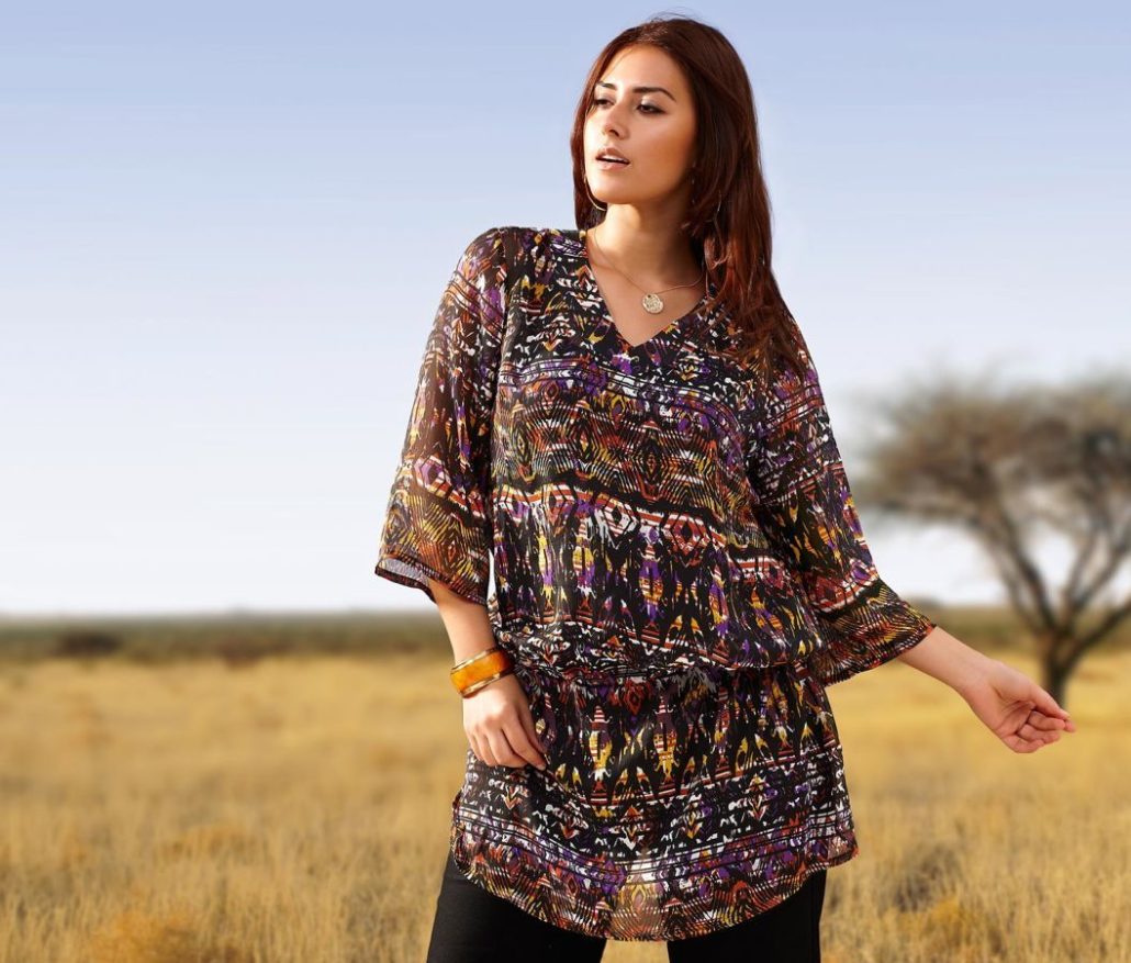 Le style ethnique dans les vêtements d'aujourd'hui est incroyablement populaire et cela ne pouvait qu'affecter les tuniques. La chose la plus pertinente sera décorée avec des motifs complexes, des motifs indiens, une manche moelleuse ou un col. Vous pouvez porter de telles tuniques avec un jean moulant ou un pantalon ample. De plus, vous pouvez utiliser plusieurs gros bracelets.