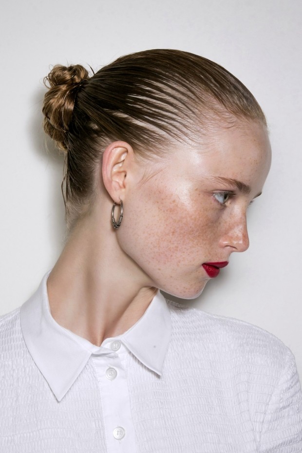 Accueil professionnel des stylistes pour le coiffage des cheveux fins: appliquez un peu de gel coiffant dans la paume de vos mains et écartez vos doigts du bas des cheveux avec les doigts écartés des racines, ce qui permettra aux poils de rester légèrement inégaux et de fixer les cheveux.