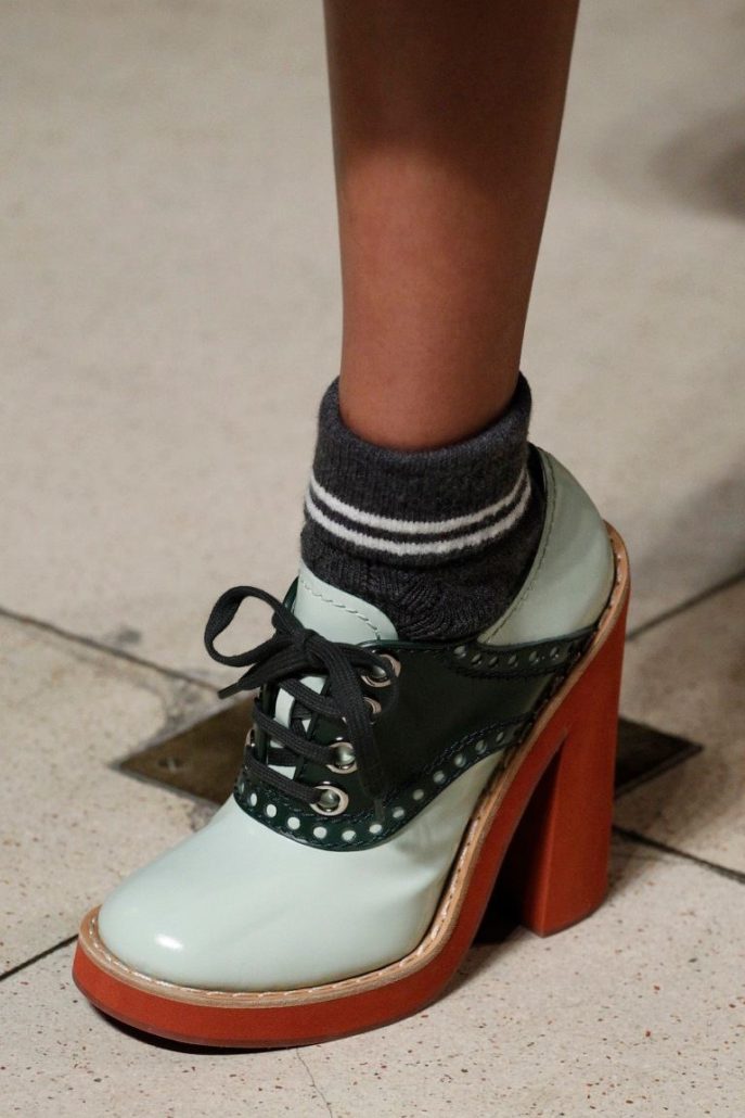 Ces chaussures étaient populaires dans les années 70 du siècle dernier. Et maintenant, la mode pour eux est revenue. On trouve aujourd'hui des chaussures à talons épais dans presque toutes les collections de mode. Le talon en eux peut être fabriqué avec une variété de matériaux. Dans le même temps, ils peuvent être en harmonie avec les chaussures ou les contraster.