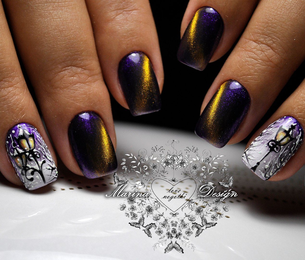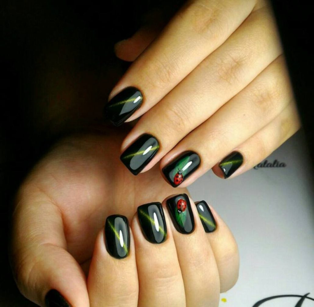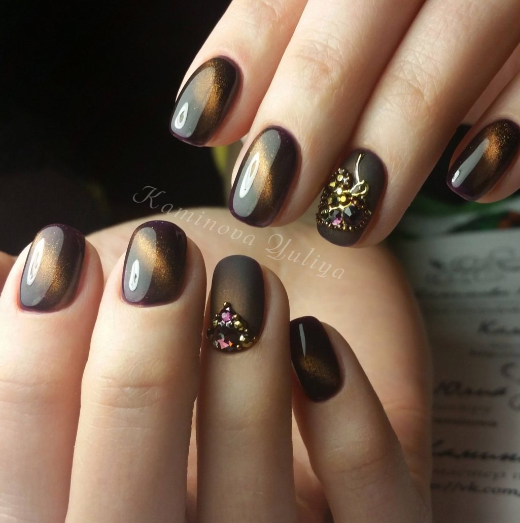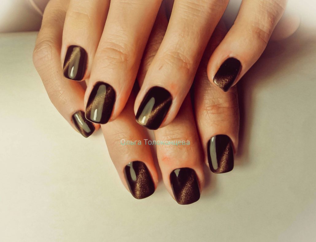 La conception «œil de chat» est accessible non seulement aux propriétaires de longs ongles. En bref, il ne semble pas moins spectaculaire. Pour sa mise en œuvre, un vernis spécial est utilisé, avec une base en métal et des aimants spéciaux, qui créent des motifs spectaculaires sur le revêtement principal, que beaucoup comparent à l'œil du chat.