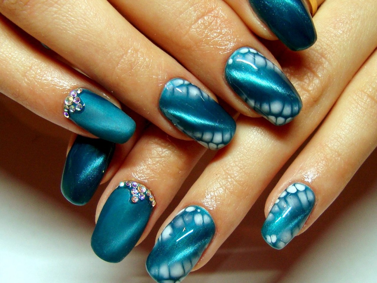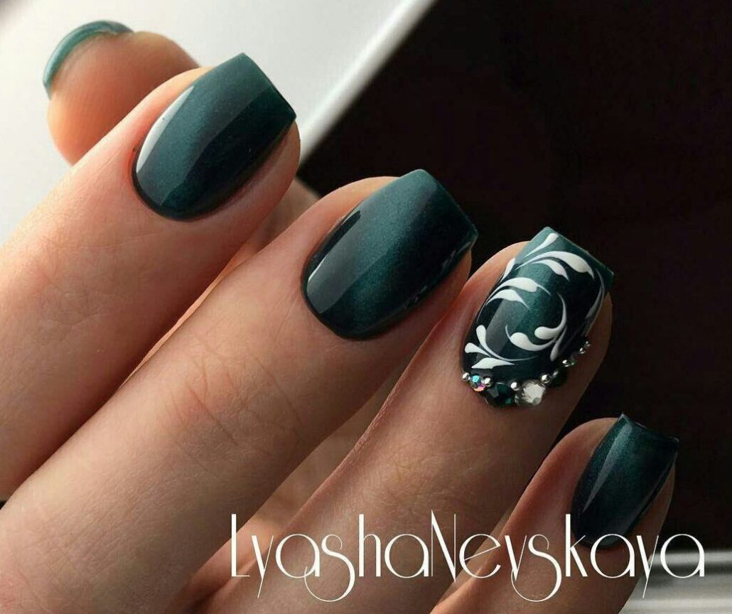 Vous pouvez ajouter des strass à n'importe quel motif (veste, ombre, manucure monochrome, etc.). Il est important de ne pas oublier le sens des proportions, sinon vous risquez de vous faire complètement mal.