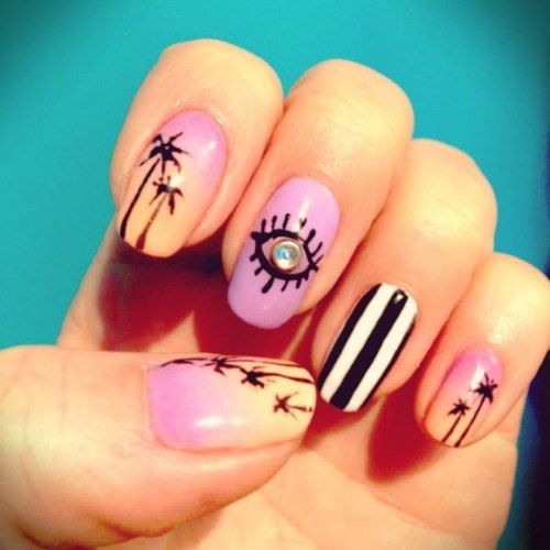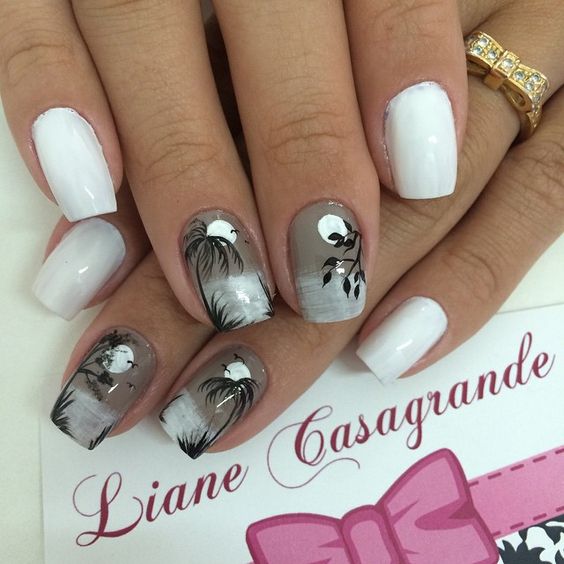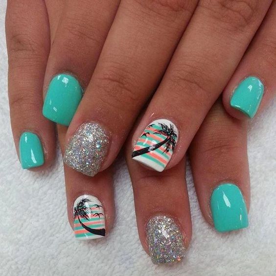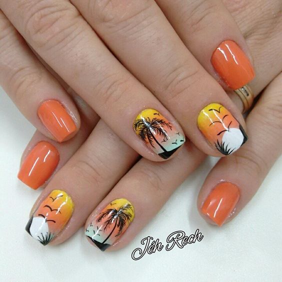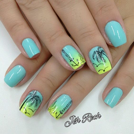 Lorsque vous vous rendez au centre de villégiature, vous souhaitez absolument souligner le fait que vous voyagez à l’avance. Par conséquent, la plupart des femmes choisissent une manucure de mer représentant l’image d’un palmier exotique sur un ou plusieurs clous. Chaque plante de manucure marine est individuelle. Il semblerait que le palmier ait l'air familier et qu'il n'ait rien d'inhabituel, mais sur les ongles, les maîtres du nail art le décrivent de manière unique et individuelle. Pas une seule manucure marine ne ressemble à un «clone». Chaque maître a sa propre vision pour une telle manucure et la paume elle-même. Et les teintes de vernis à ongles sont utilisées de différentes manières: jaune, vert, bleu, orange et même noir. Vous pouvez vous baser sur des exemples de photo de manucure marine, dans lesquels l'accent est principalement mis sur une plante tropicale.