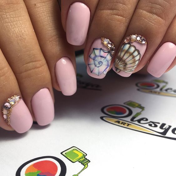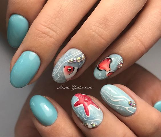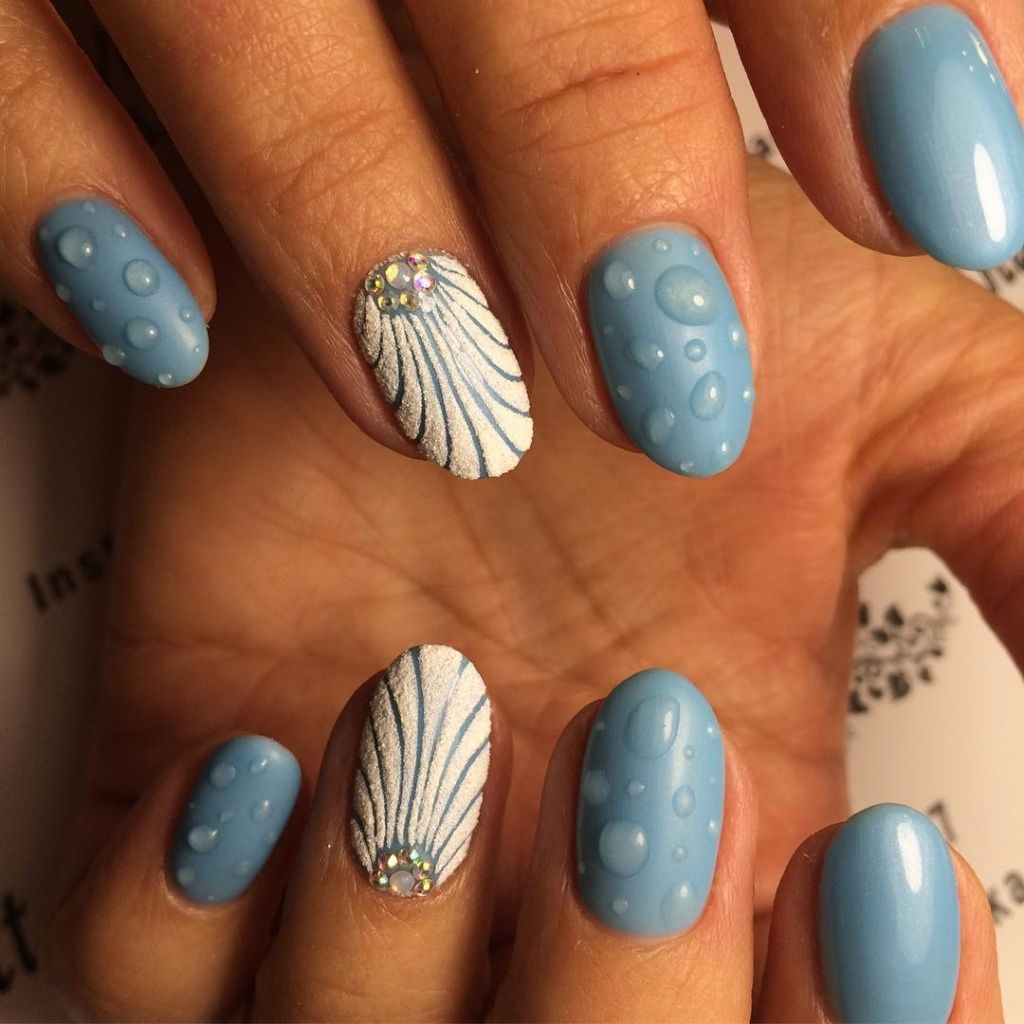 Vous pouvez rendre une manucure marine plus spectaculaire à l'aide d'éléments décoratifs. Les strass soulignent parfaitement la beauté du design choisi pour les ongles d'été. Les paillettes imitent assez bien le sable sur une plage propre sous le drapeau bleu. Le matériau permettant de créer l’effet du verre brisé peut être joué et recréé sur l’ensemble des ongles avec un rivage sableux près de la mer. Toutes les options de manucure marine sont extraordinaires. Le thème de la mer et de la plage de sable est très populaire. C'est pourquoi le rêve des maîtres du nail art est en train de grandir et de se manifester chaque saison de plus en plus.
