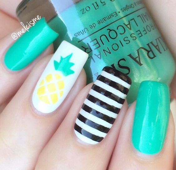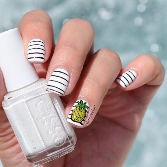 Pas seulement les palmiers, les rayures et les ancres préfèrent les fashionistas lors du choix d’une manucure estivale. Des étoiles de mer, des ananas, des ornements sans prétention, des glaces, des bateaux, des plumes d’un oiseau de feu, des vagues marines, des écailles de poisson et de nombreux autres dessins thématiques liés à la saison estivale s’allaient bien sur des ongles courts et longs. Personne ne vous reprochera de choisir une image audacieuse de l’orientation estivale, puisque tout cela est directement et indirectement associé à des vacances d’été en mer. De superbes options d'autocollants sur le thème de la marine sont disponibles dans les showrooms et les magasins. En choisissant un bel autocollant et en faisant un polissage au gel de manucure, vous pouvez vous reposer sans penser à des ongles ébréchés pendant les vacances. De merveilleuses idées sont proposées sur la photo d'une manucure marine avec une photo.