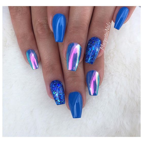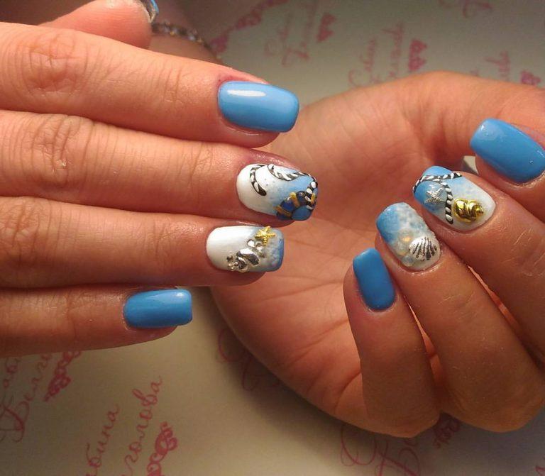 La mer claire est immédiatement associée à la couleur bleue. Par conséquent, peindre les ongles dans n'importe quelle nuance de bleu améliore immédiatement l'ambiance. C'est juste que les chefs-d'œuvre se dressent sur des ongles féminins de couleur bleue avec holographie, paillettes d'or, dessins thématiques et sculptures. Surtout pour vous, nous avons compilé une sélection de photos de manucure marine en bleu et ses nuances.