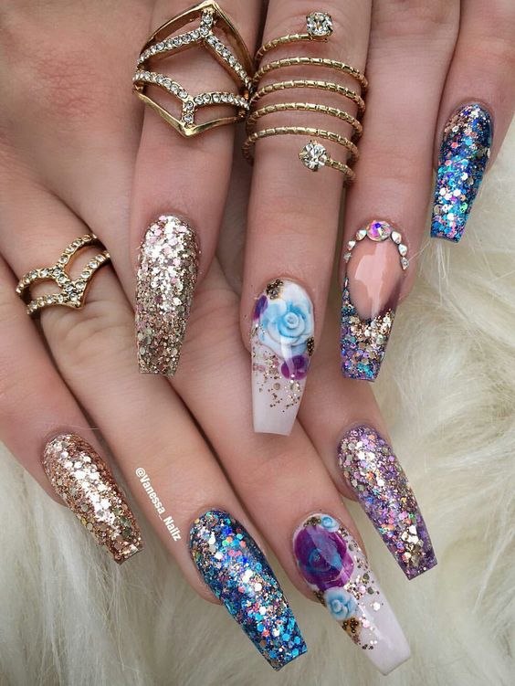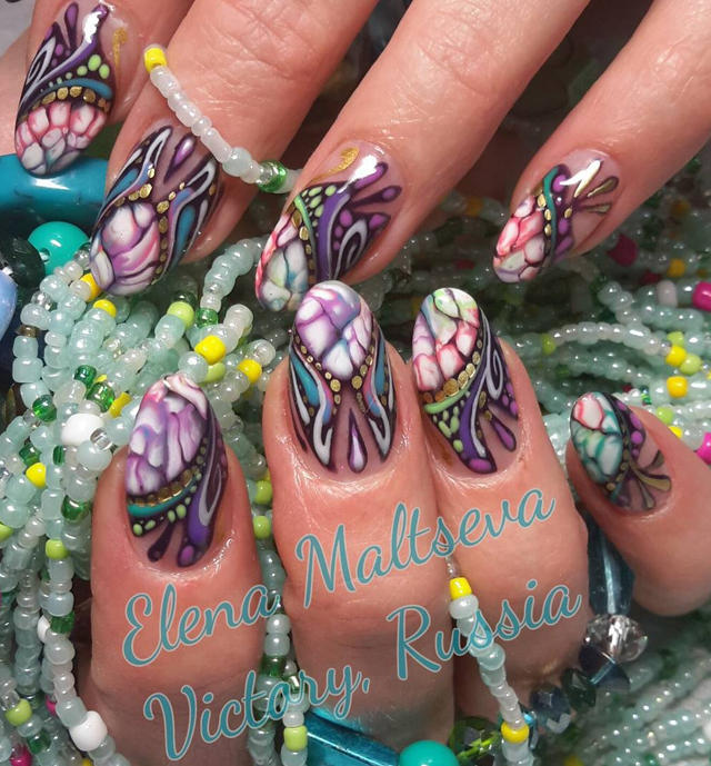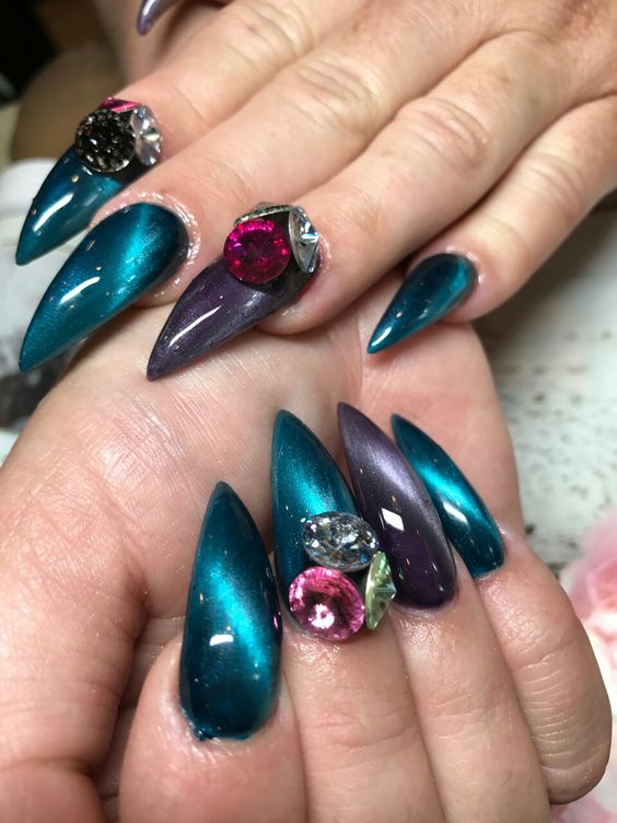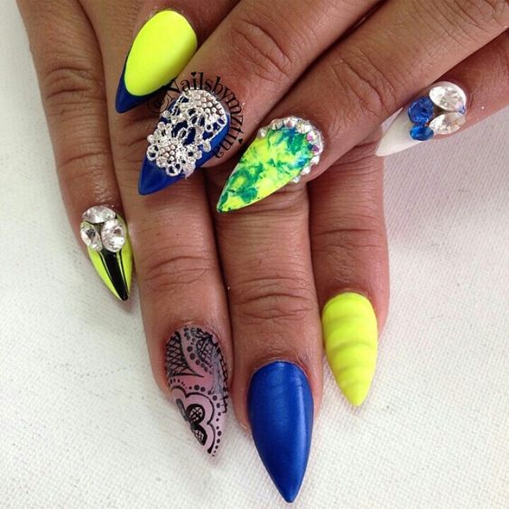 Voulez-vous être sur la même longueur d'onde que vos idoles? Alors les couleurs vives sont votre moyen de réussir! Vous pouvez actualiser n'importe quelle image à l'aide de clous verts et bleus. Bien sûr, cela ne correspond pas au style commercial, mais il est incroyablement intéressant pour les ongles longs et courts étendus.