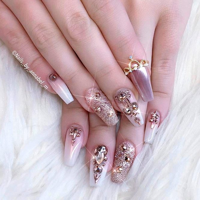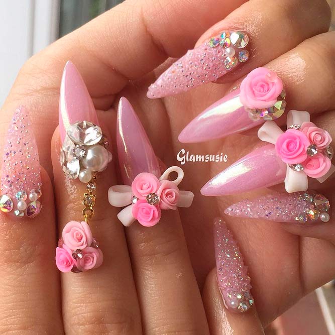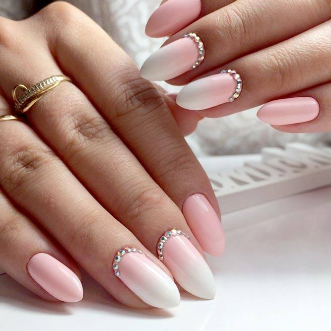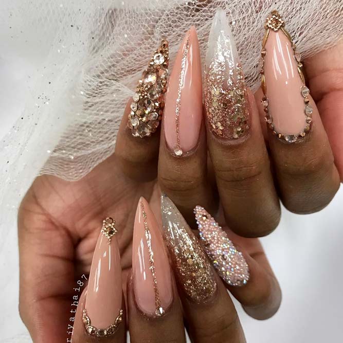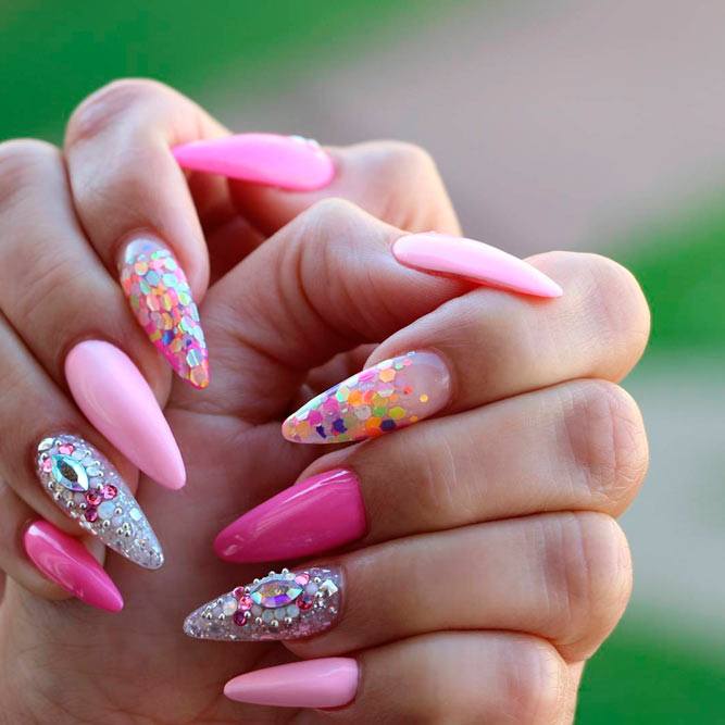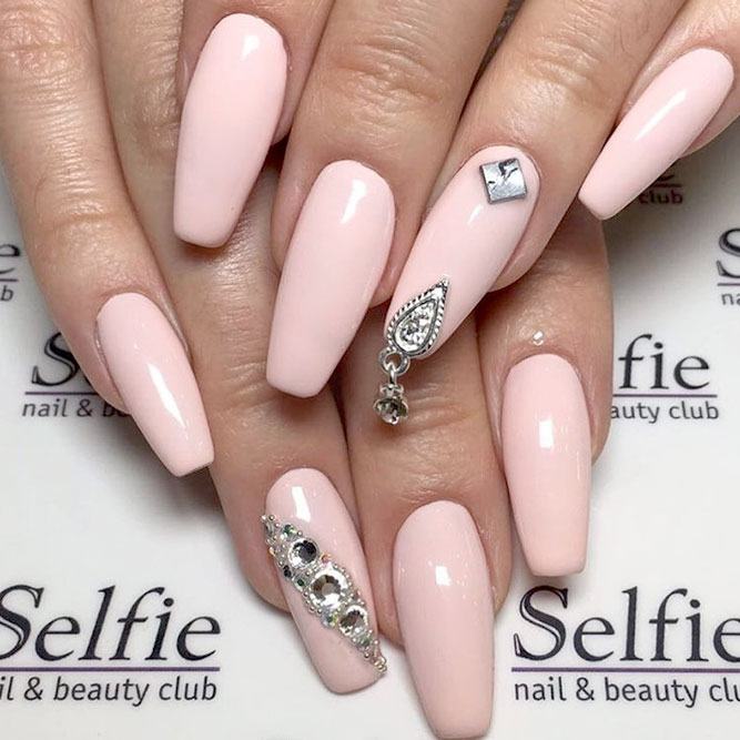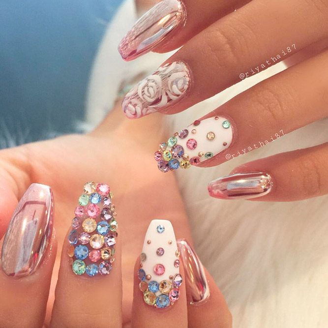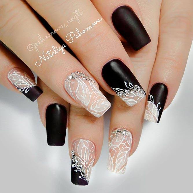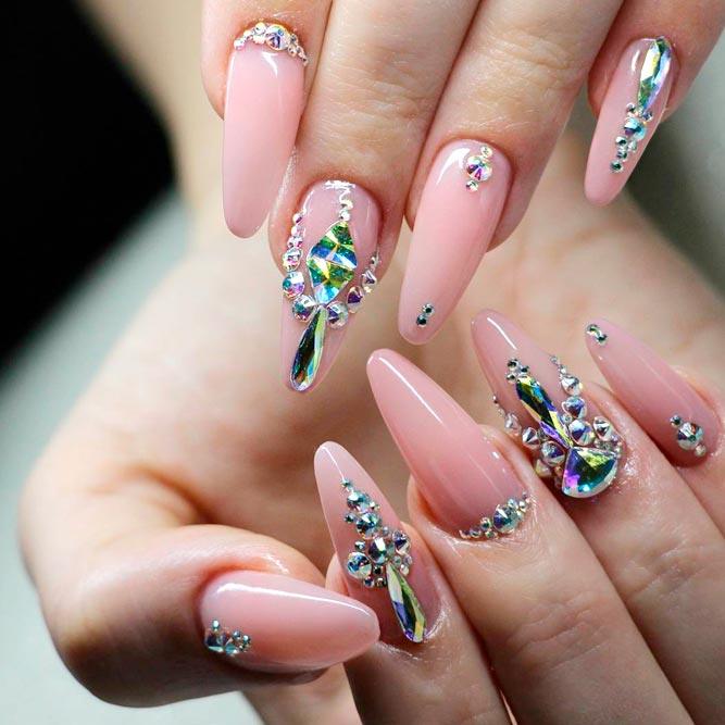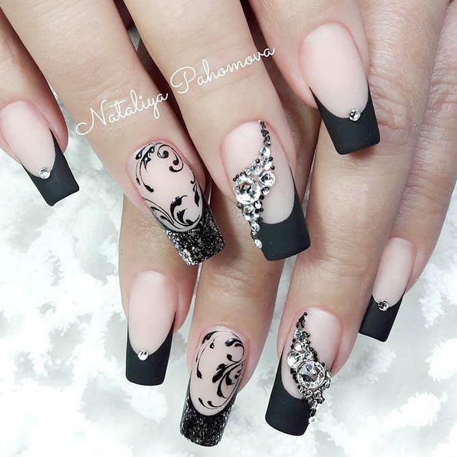Les paillettes et les strass constituent un élément de décoration très brillant, attrayant et efficace. Utilisez de grosses pierres pour les appliquer sur l'annulaire sur toute sa surface et placez de petites paillettes sur les ongles restants. Si vous souhaitez créer l'image d'une princesse tendre et mignonne, optez pour une forme ovale de clous décorés en rose, avec l'ajout de strass sur le bord de l'annulaire et d'une pierre au sommet de chaque doigt. Pour les beautés audacieuses et extravagantes, les strass ou les paillettes en noir sont parfaits.