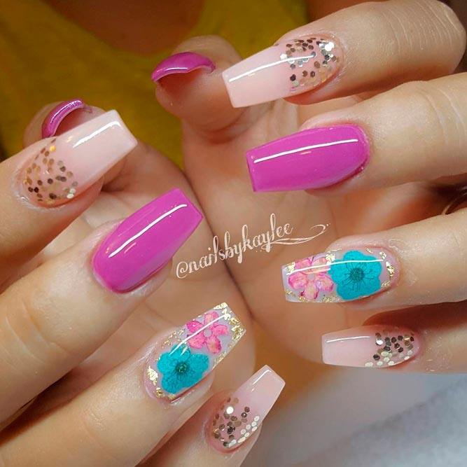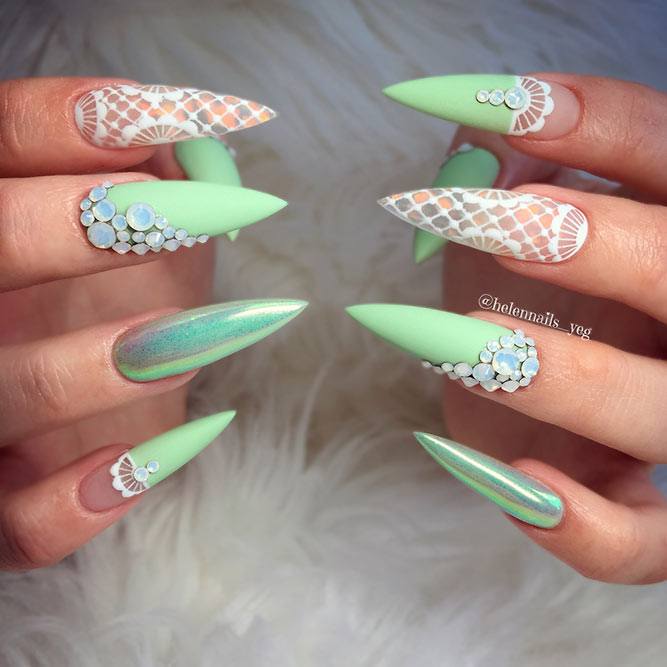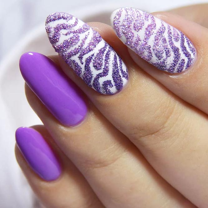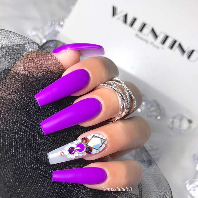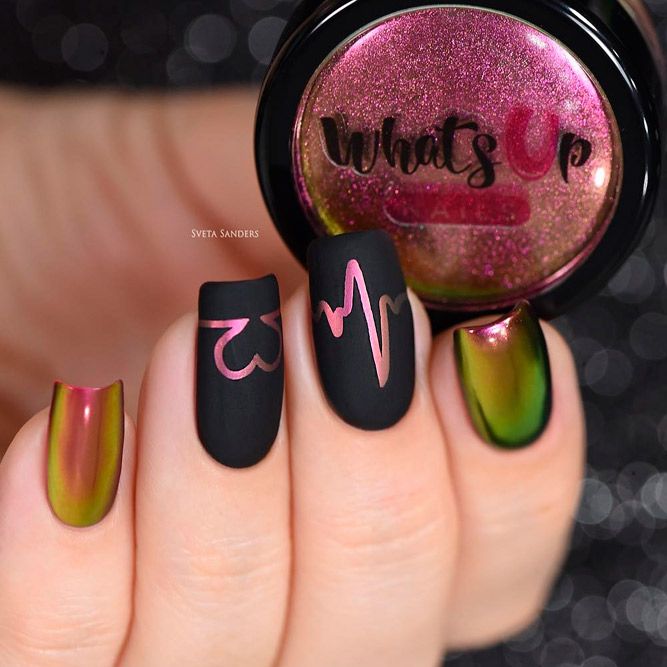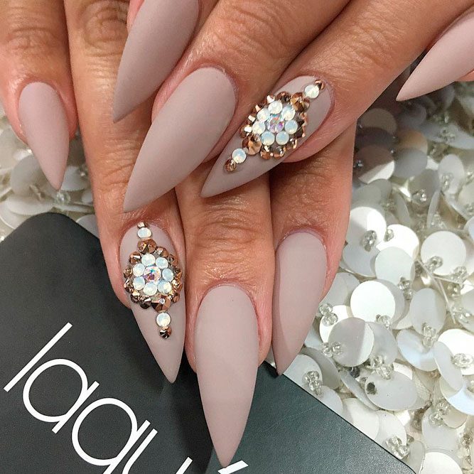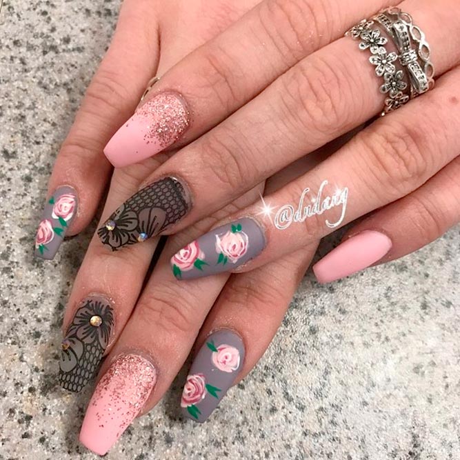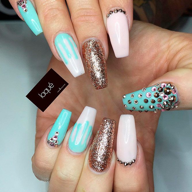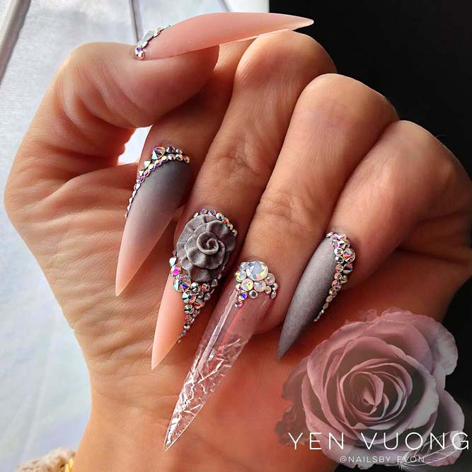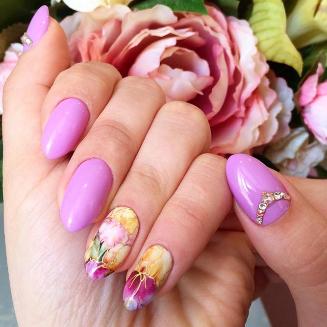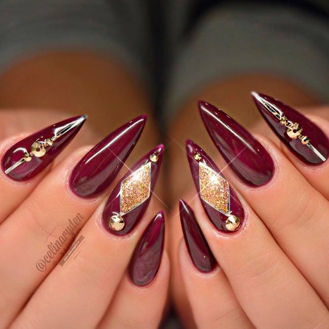 Les paillettes et les strass constituent un élément de décoration très brillant, attrayant et efficace. Utilisez de grosses pierres pour les appliquer sur l'annulaire sur toute sa surface et placez de petites paillettes sur les ongles restants. Si vous souhaitez créer l'image d'une princesse tendre et mignonne, optez pour une forme ovale de clous décorés en rose, avec l'ajout de strass sur le bord de l'annulaire et d'une pierre au sommet de chaque doigt. Pour les beautés audacieuses et extravagantes, les strass ou les paillettes en noir sont parfaits.