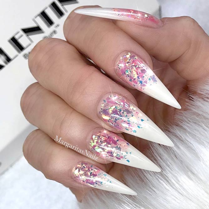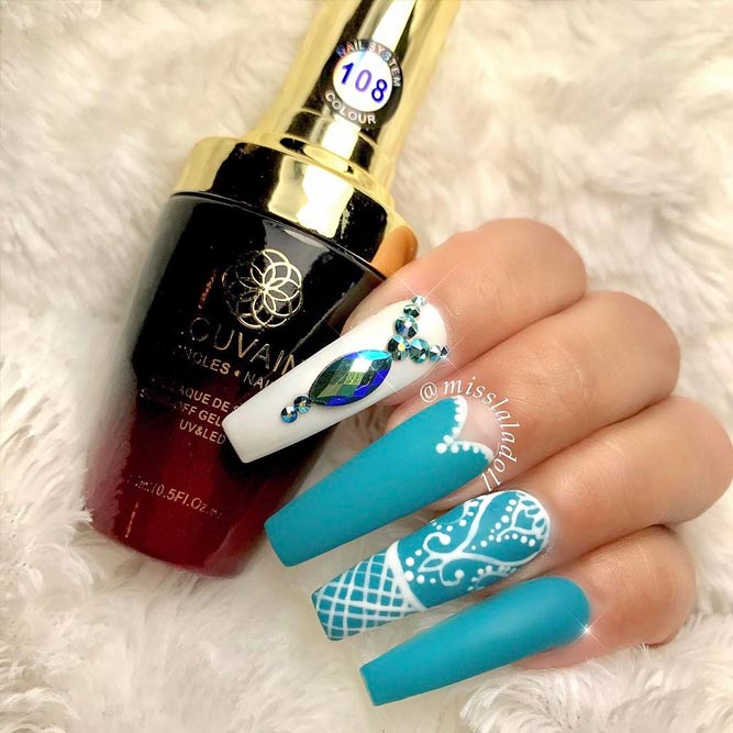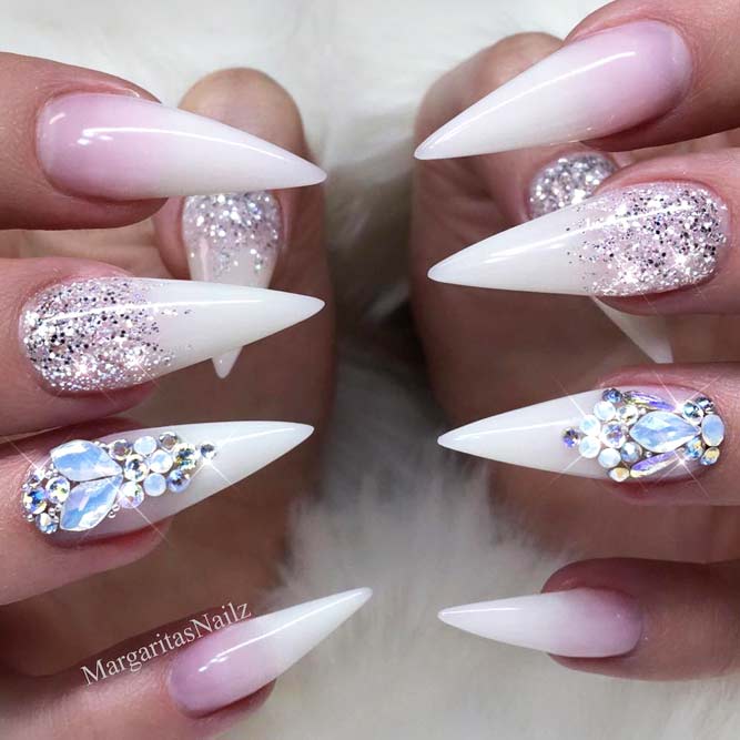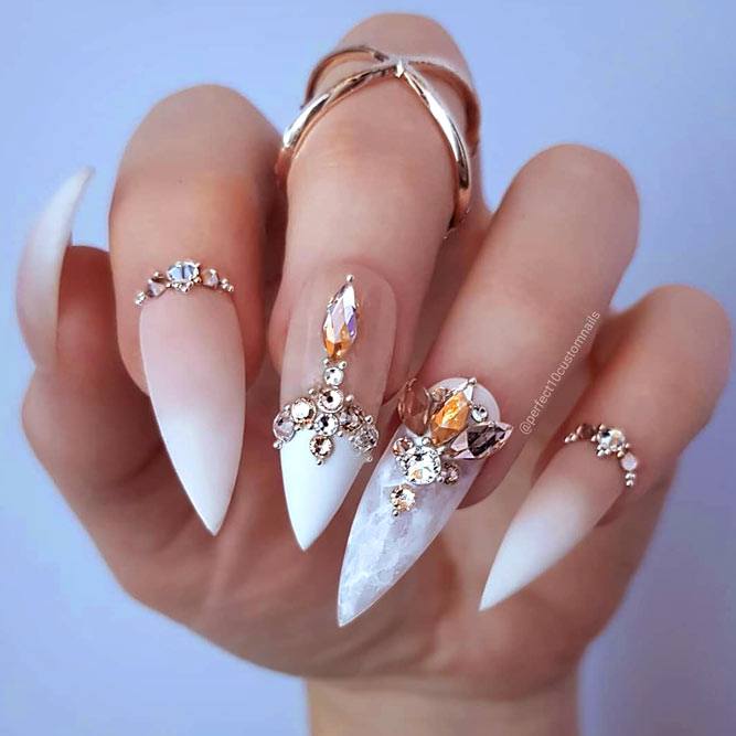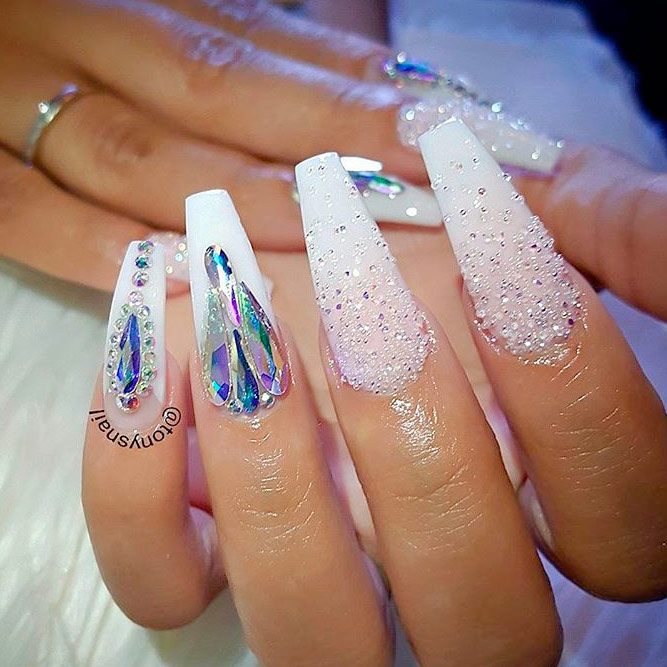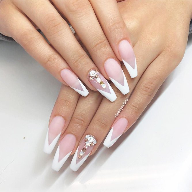 Manucure blanche pour les ongles étendus dans la nouvelle saison est rarement utilisé en monochrome. De plus en plus de maîtres en nail art préfèrent la combinaison d'un revêtement blanc avec d'autres nuances. La combinaison de couleur blanche avec la décoration en strass est particulièrement impressionnante sur les ongles allongés.