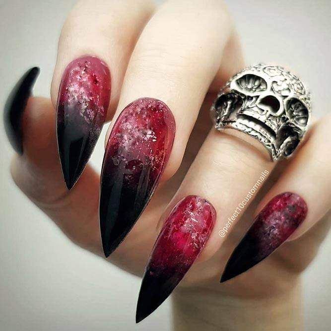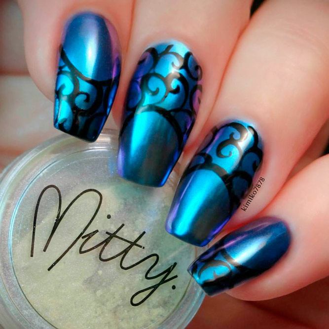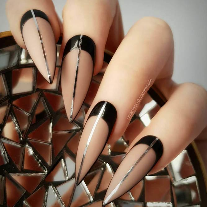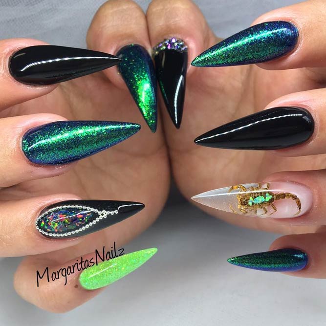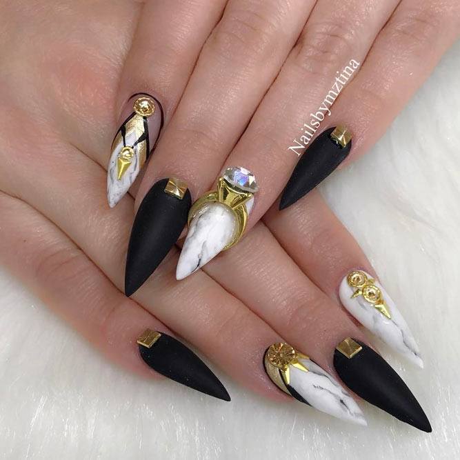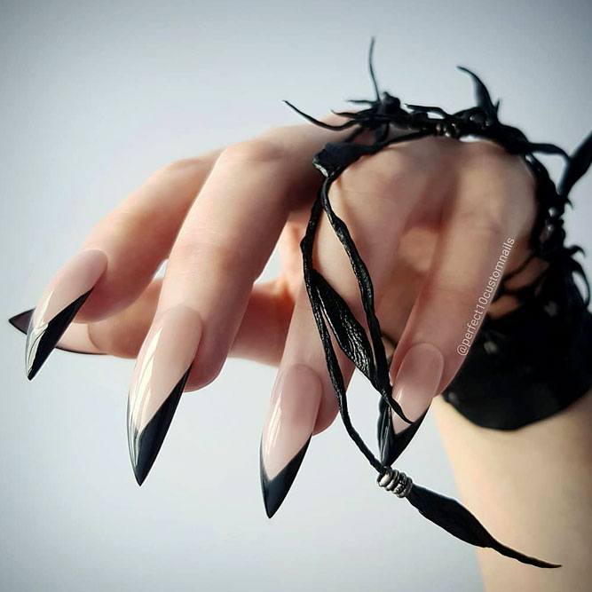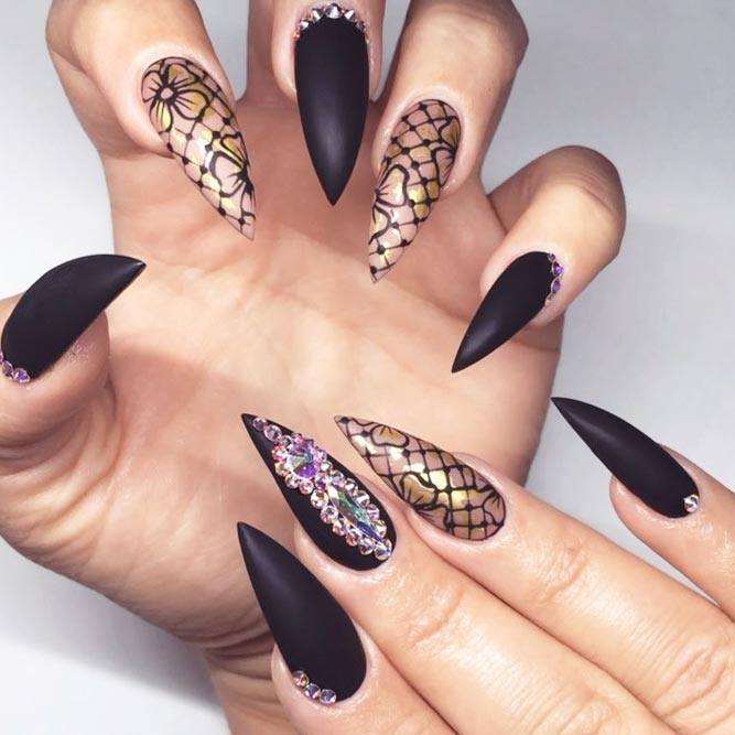 Pour les filles qui préfèrent l'extravagance, la meilleure option sera d'utiliser des ongles allongés à la mode en noir. Un tel revêtement est souhaitable pour se diversifier avec des strass décorés, des paillettes, des paillettes, des confettis. Mais une version noire unie a fière allure.