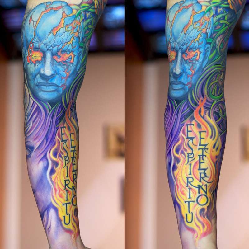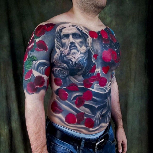 Le principal avantage d'un tatouage de couleur réside dans son accrochage et sa capacité à exprimer pleinement le sens et le caractère. Les couleurs vives et contrastées sont caractéristiques des personnalités audacieuses et extraordinaires à la disposition explosive et au point de vue optimiste de la vie. Les couleurs vives les plus appropriées dans la technique de l'aquarelle, du réalisme et de la polka trash. De manière inhabituelle et attrayante, une manche complètement bouchée ressemble à une fleur ou à d’autres éléments, une fleur lumineuse sur n’importe quelle partie du corps. Très souvent, il y a une fusion de styles dans un dessin pectoral très beau et dynamique. Les tatouages de couleur sont effectués à la fois par les hommes et les femmes.