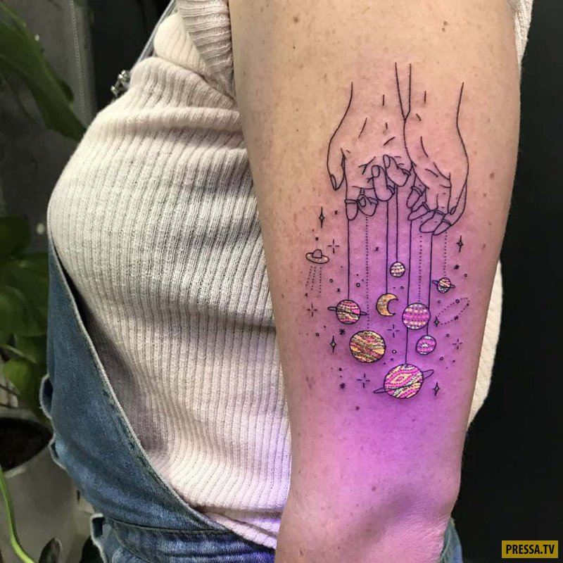 Les images ultraviolettes et blanches sont très populaires parmi les jeunes. D'accord, il est très inhabituel de voir un tatouage violet lumineux à la veilleuse ou, inversement, un motif blanc pâle. Dans ce cas, le thème du tatouage peut être très varié et sa taille peut varier des petites images au format grand format.