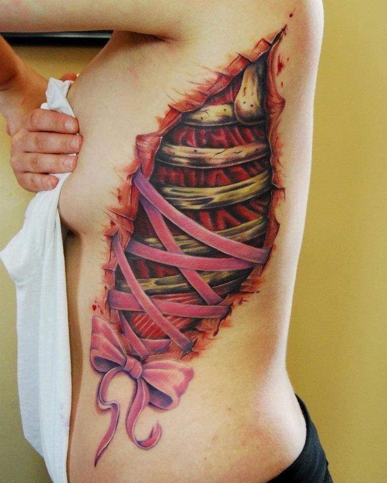 Images en trois dimensions - une technique qui attire beaucoup l'attention sur la conception réaliste, et peut facilement induire en erreur. La dynamique correctement transmise, la maîtrise de l’art du clair-obscur sont capables de reproduire des dessins étonnants. Par exemple, l’imitation de cavités dans le corps, les fermetures à glissière et le laçage, l’image des os nus, bien sûr, font sensation.