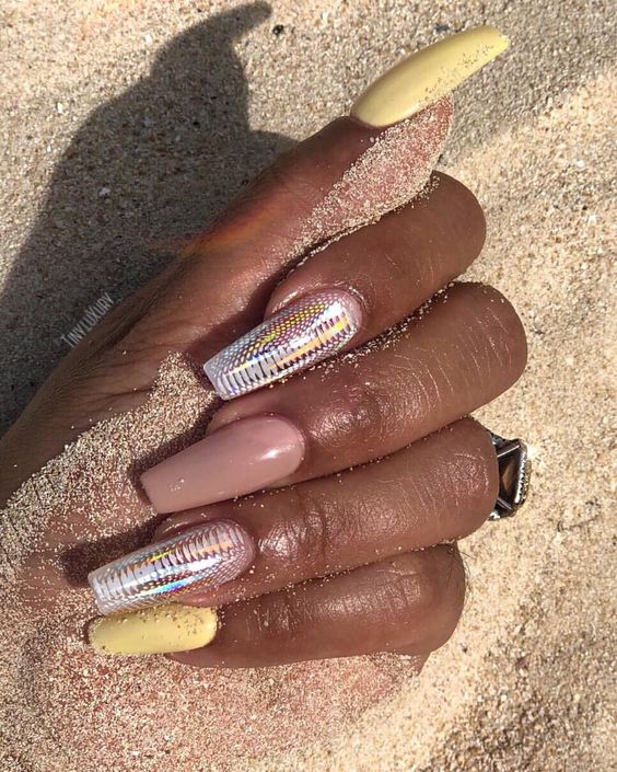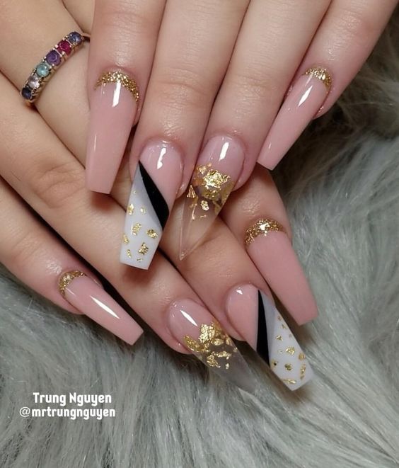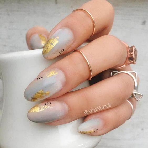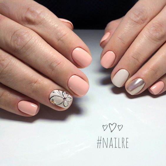 L'utilisation de papier d'aluminium, de poudre acrylique, de toutes sortes d'étincelles, de pierres et de strass n'est pas superflue dans l'exécution d'une manucure, mais en utilisant ces décorations, il ne faut pas oublier que la manucure nue est un phénomène naturel. Vous ne pouvez pas en faire trop avec des bijoux. L'option la plus optimale dans une manucure nue est le minimalisme. Le minimalisme est toujours à la mode. Après avoir complété vos ongles avec un minimum de bijoux, vous recevrez une manucure unique, élégante et à la mode. Un motif géométrique formé de fines lignes ou d'une simple ligne au milieu d'un ongle peut servir d'image, de fleur ou de feuille délicate. En 20269, les petits points ou les traits chaotiques sont pertinents. De petites taches d'étincelles, de papier d'aluminium ou de ruban adhésif brillant auront fière allure, mais vous devez être très prudent avec cela, car le minimalisme implique peu.