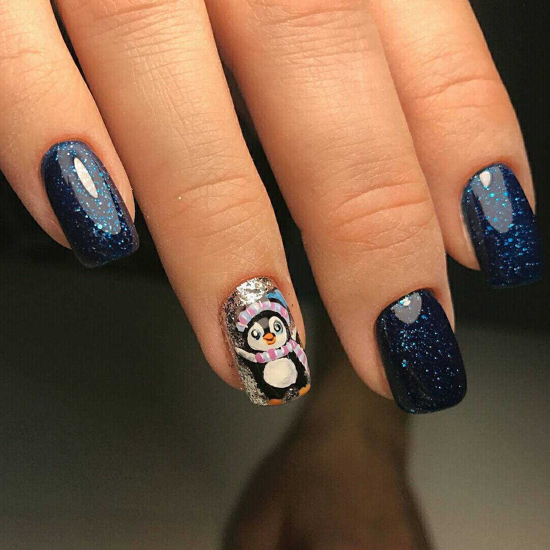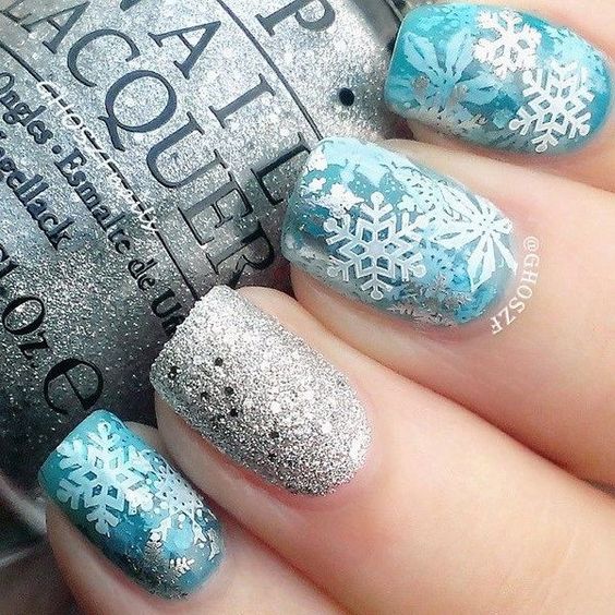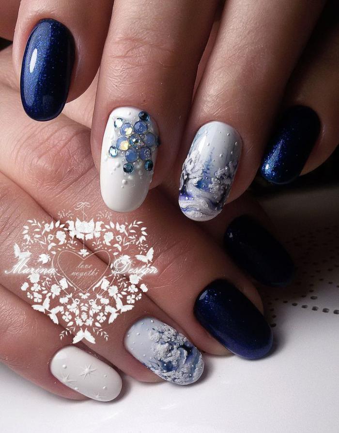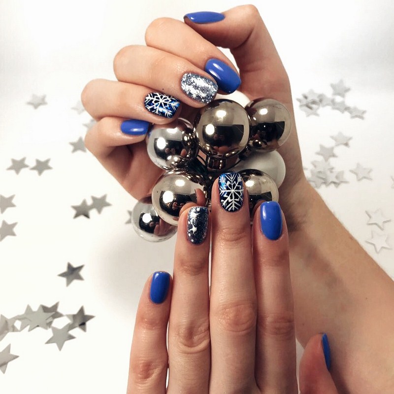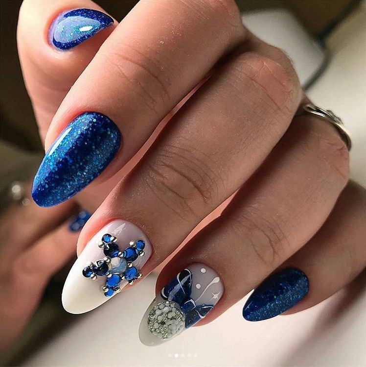 Manucure d'hiver avec des paillettes et des étincelles lumineuses.