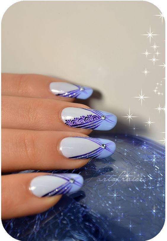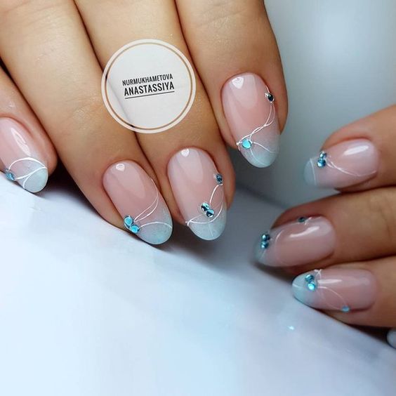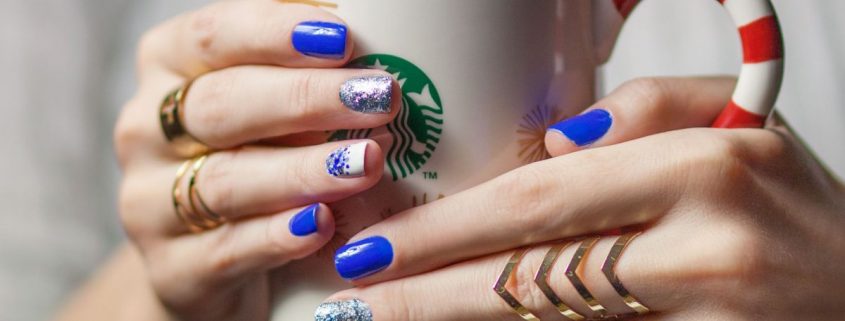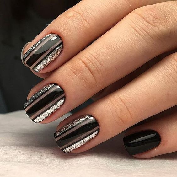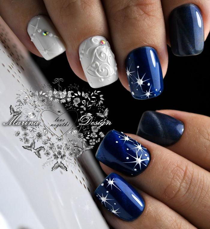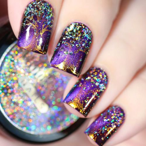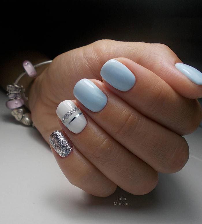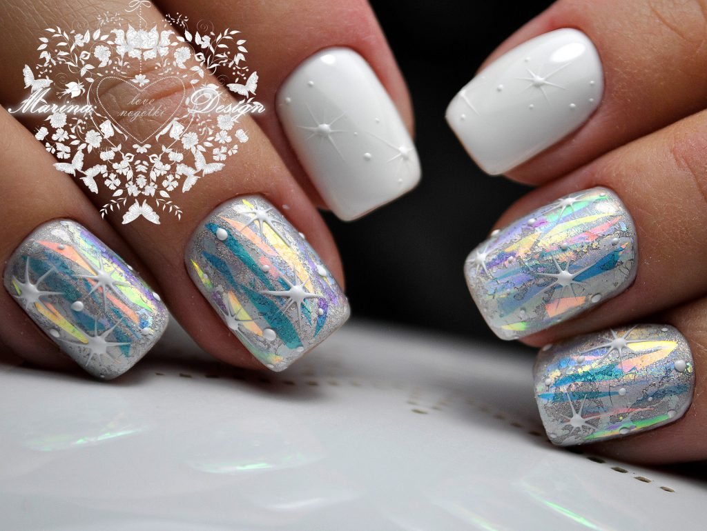 Manucure d'hiver avec des paillettes et des étincelles lumineuses.
