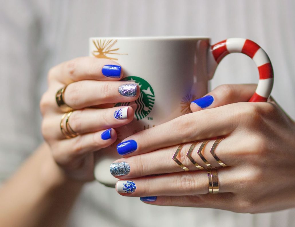 Manucure d'hiver avec des paillettes et des étincelles lumineuses.