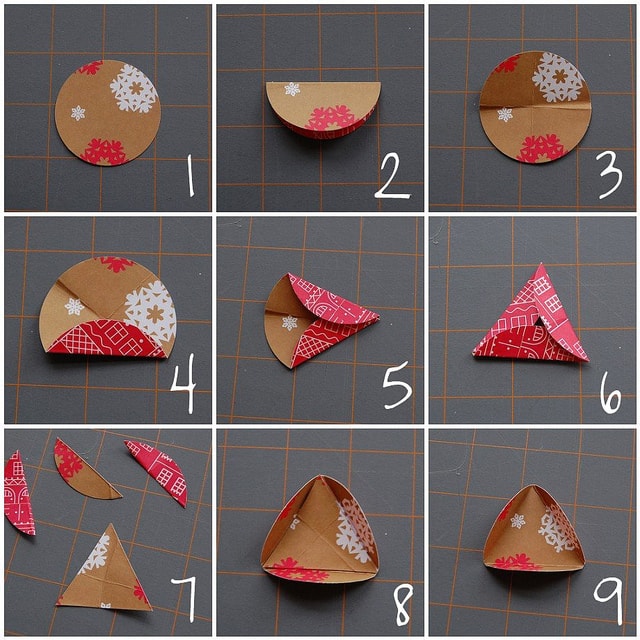 Nous allons utiliser l'un d'eux comme modèle. Pour ce faire, pliez-le en deux et décalez-le légèrement sur le côté, comme indiqué sur la photo. Nous formons un triangle et coupons toutes les parties en excès, le laissant comme modèle. Nous prenons la pièce, y plaçons un triangle et plions légèrement les bords restants. Alternativement, répétez la même chose avec chacun.