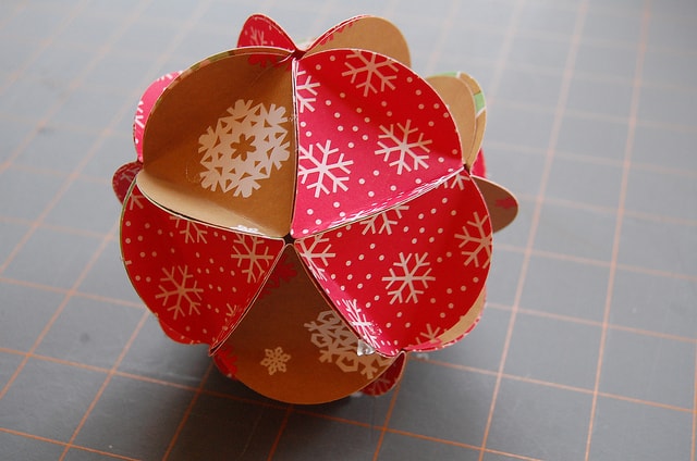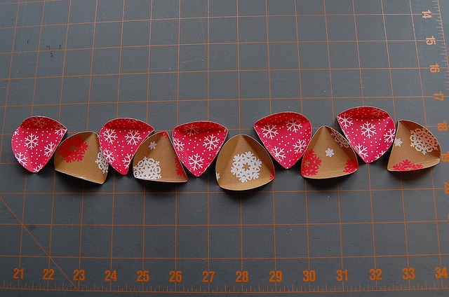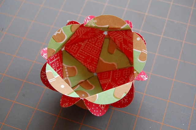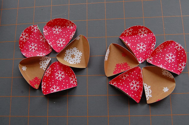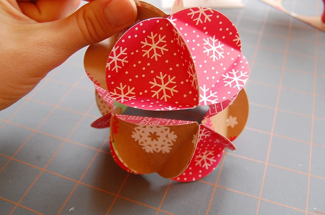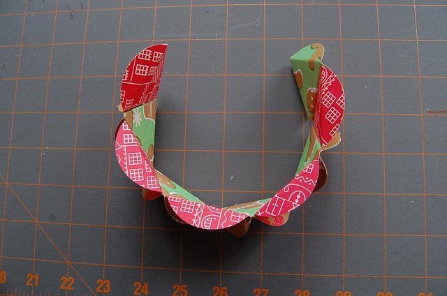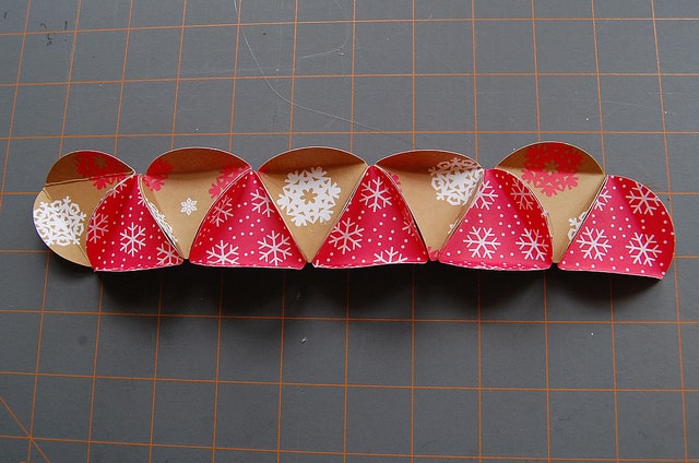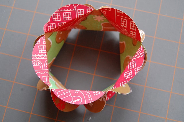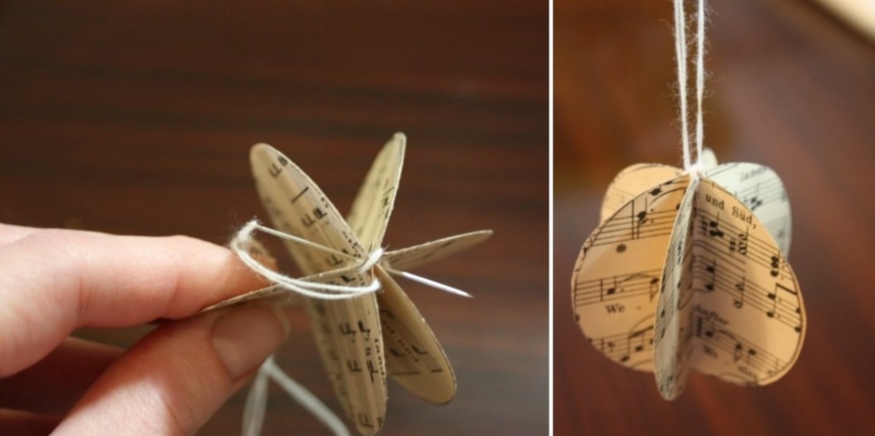 Nous plions six cercles en deux et les collons ensemble. Nous attachons un fil dense ou une ficelle à la base afin que le jouet puisse être suspendu à un arbre de Noël.