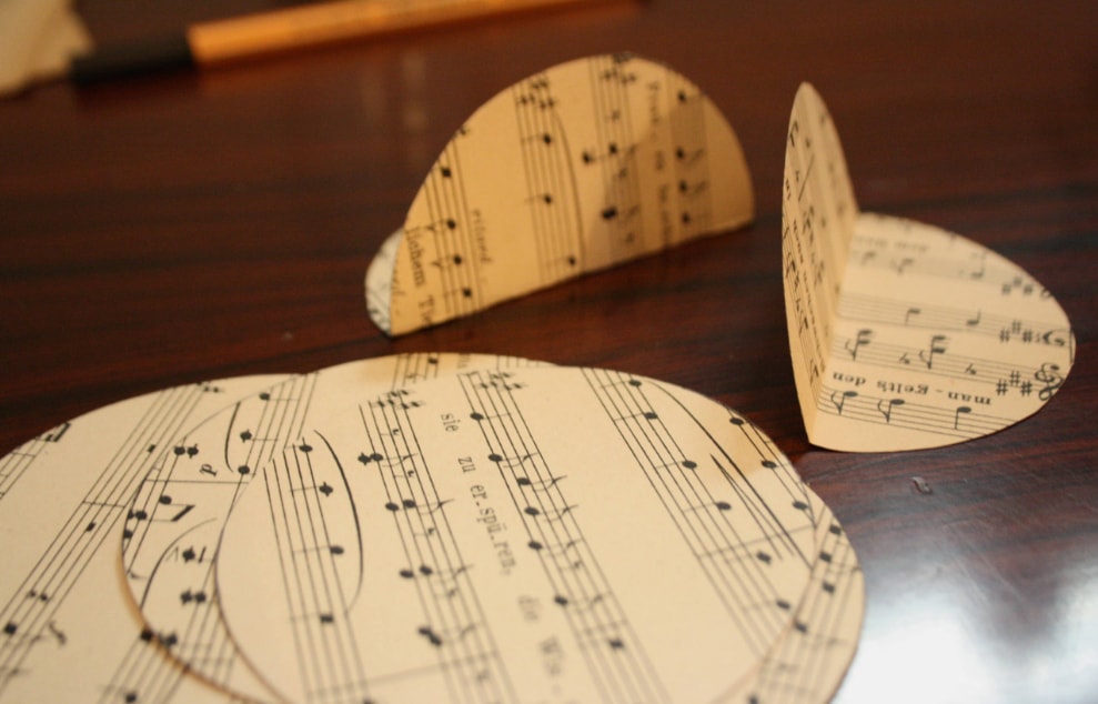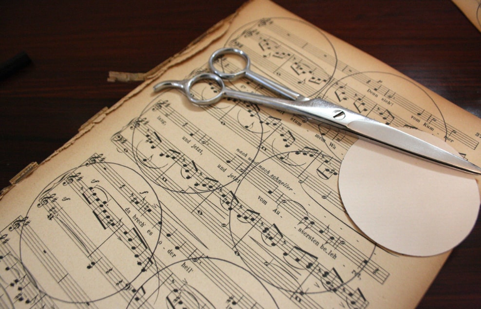 Du carton, nous fabriquons un gabarit de forme ronde et le découpons. La taille du modèle peut être quelconque. Nous l'entourons sur des feuilles avec des notes et le découpons.
