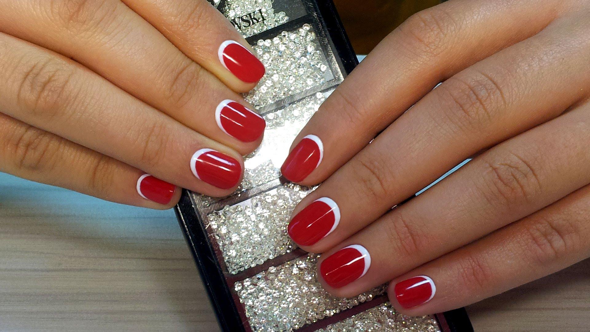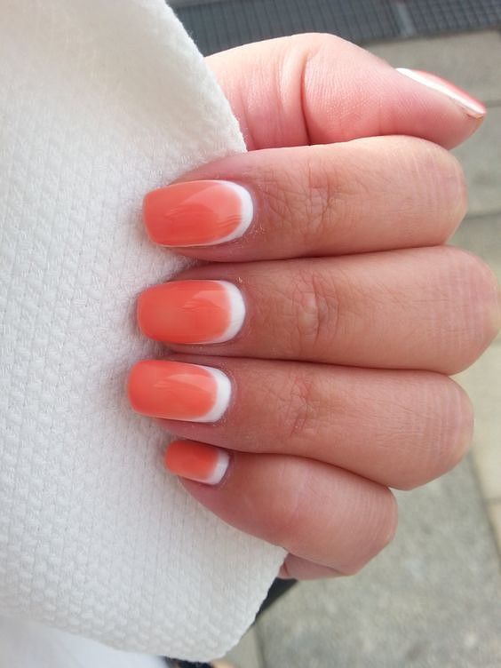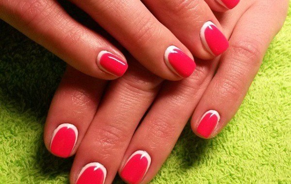 Ensuite, vous devez dégraisser la plaque à ongles et appliquer la couche principale de vernis. Dans la version classique, le rose est le plus souvent choisi. Si vous utilisez des gels lustrants, veillez à bien sécher les ongles de la lampe. Après cette étape, appliquez une couleur contrastante sur le bord de l'ongle. Si nécessaire, vous pouvez utiliser un pochoir ou le fabriquer vous-même avec du ruban adhésif. Lorsque la deuxième couche est sèche, appliquez une couche de finition et assurez-vous de la sécher dans la lampe. Ceux qui utilisent des vernis simples n'ont pas besoin de faire le dernier pas.