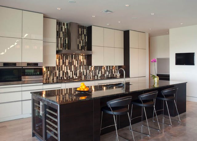 Si vous avez choisi un revêtement brillant, vous devez être prêt pour le nettoyage continu du tablier, car même un peu de pollution sur un tel fond attirera l’attention. Les tabliers de cuisine les plus appropriés sont les tons neutres. Un point fort dans ce cas peut être la texture du revêtement.