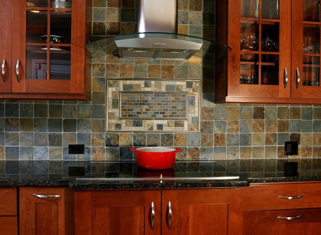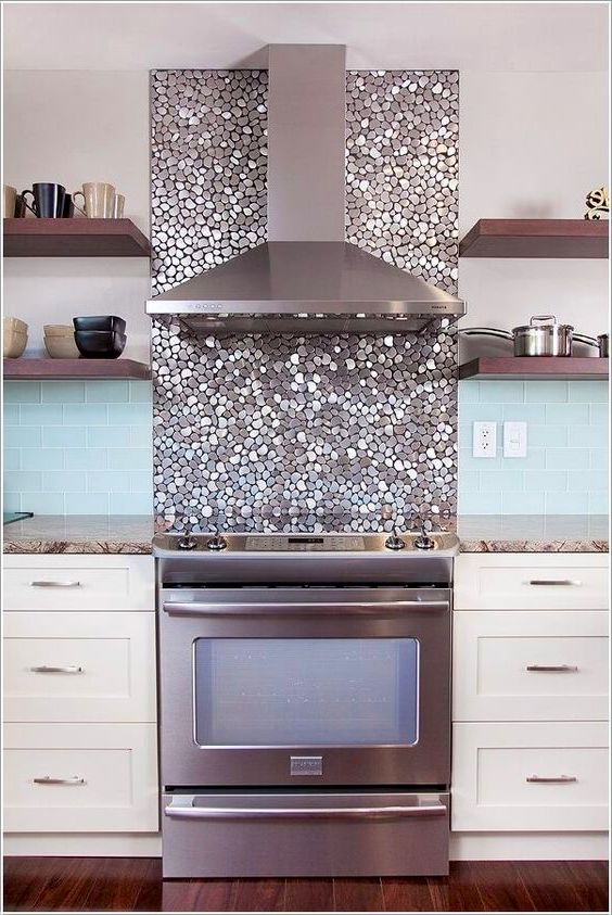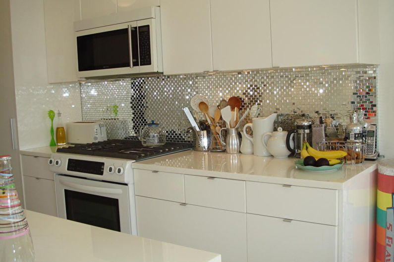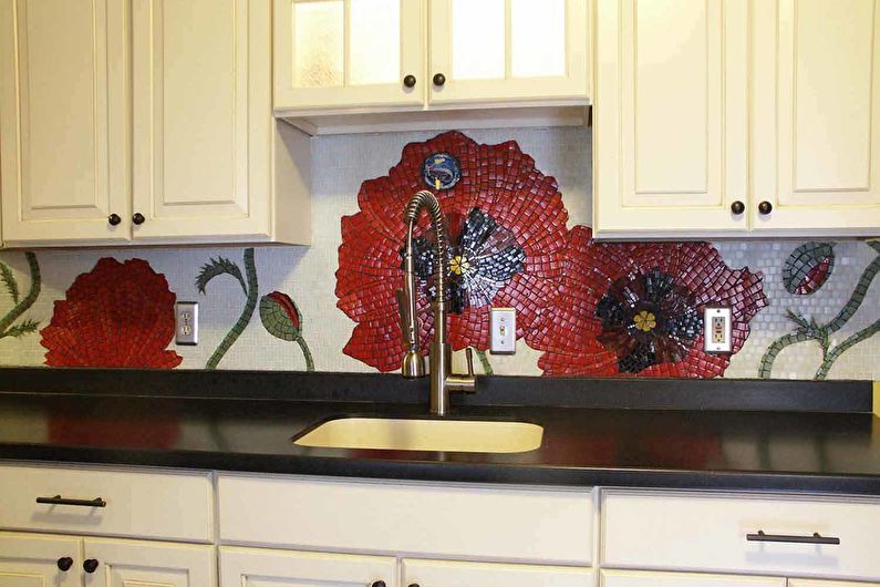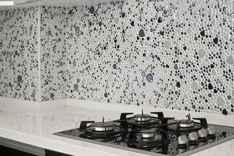 La composition en mosaïque a toujours l'air compliquée et élégante. Il peut être utilisé pour créer des motifs abstraits, divers motifs ou couleurs. Le matériau de ces pièces peut être très différent, ce qui affectera non seulement l'apparence du tablier, mais aussi ses propriétés pratiques.