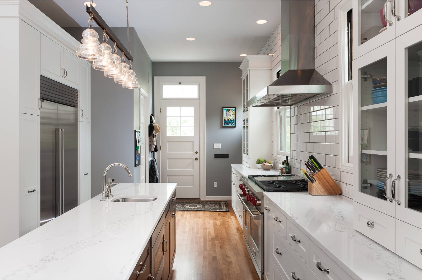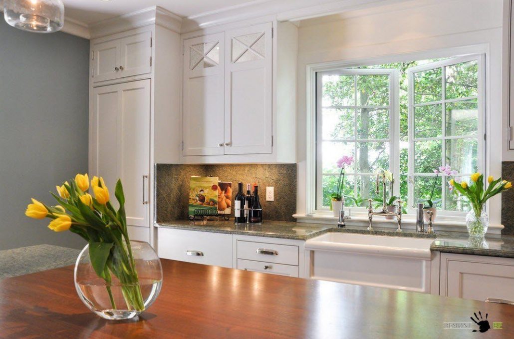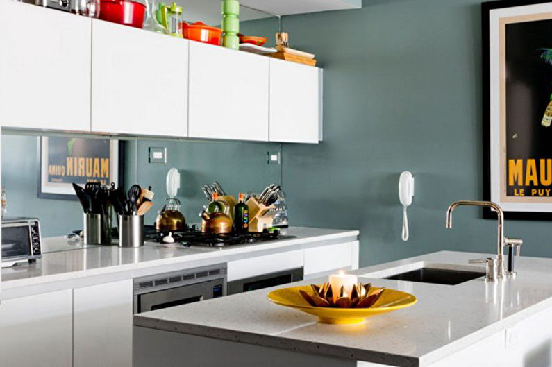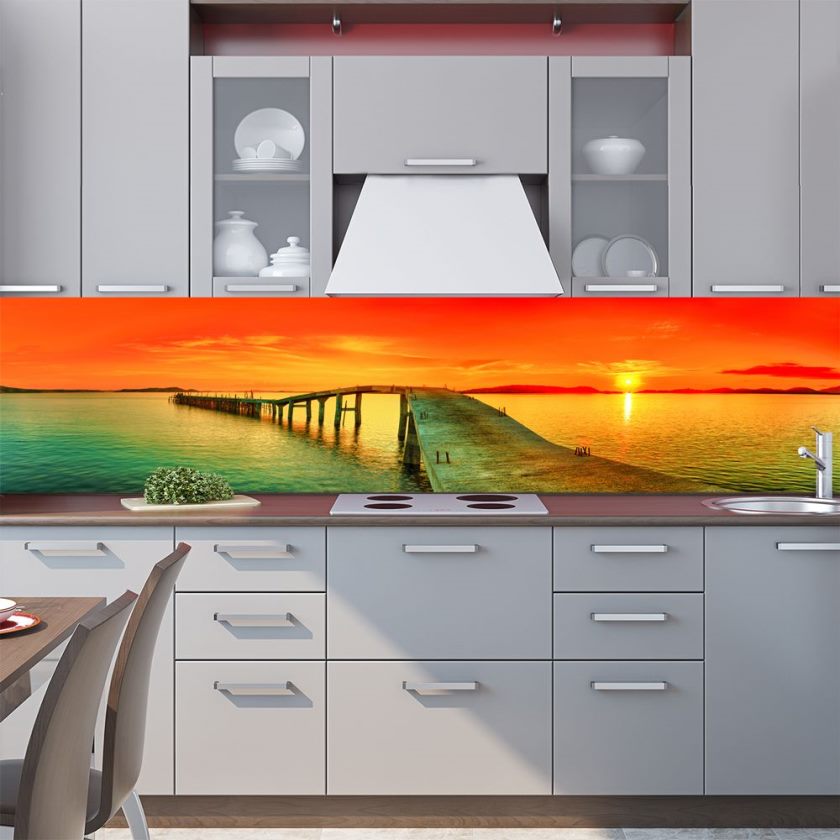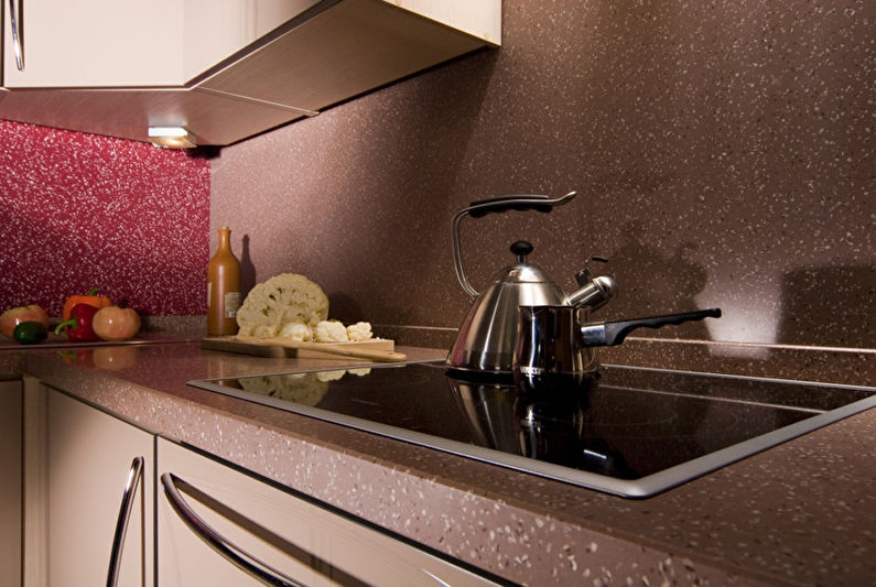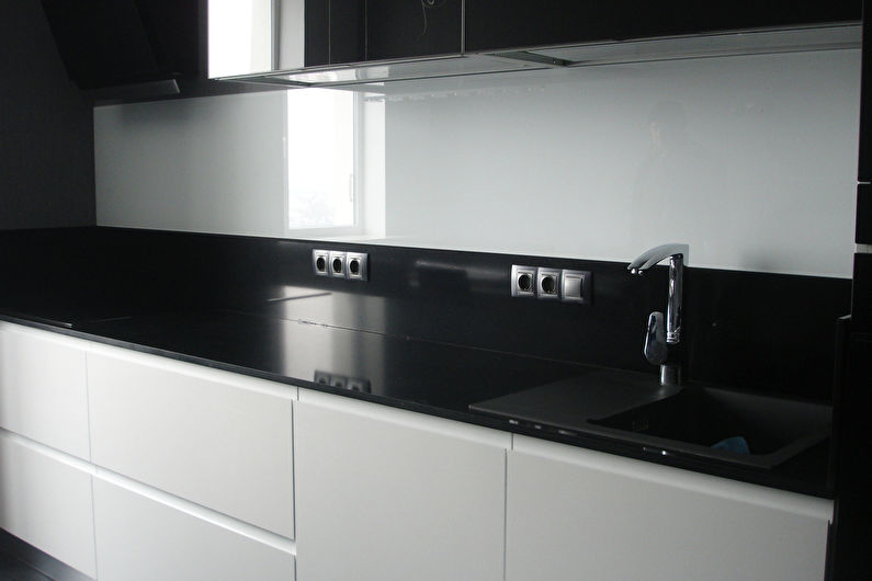 La conception d'un tel revêtement peut être monophonique ou imiter la texture d'autres matériaux. L'impression de photos est utilisée pour donner de la luminosité à la zone de travail. L'inconvénient de ce matériau de finition est son prix élevé et la nécessité de passer une commande en fonction de la taille du tablier, ce qui est associé à la complexité du processus de découpe du verre.