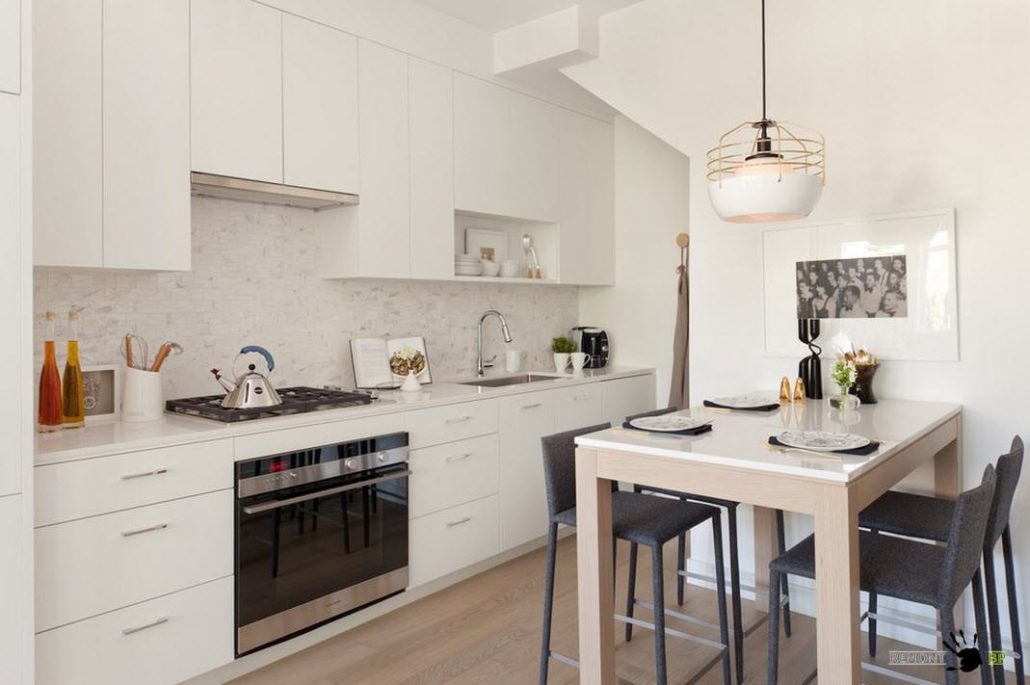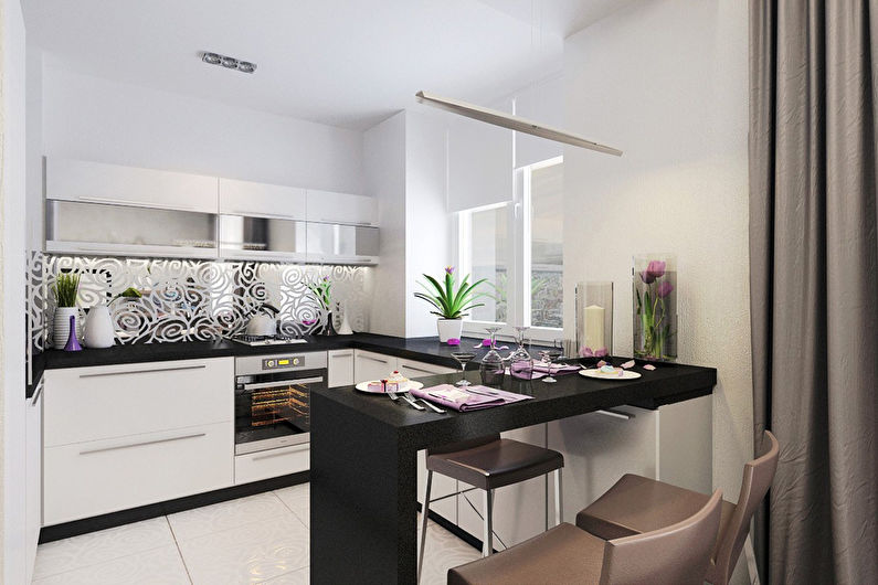 La surface sombre est considérée comme peu pratique. Mais si vous décidez toujours de saturer le tablier, vous devez "étouffer" le reste de la cuisine. Pour allonger visuellement la pièce, utilisez des rayures horizontales. Une surface de miroir rendra la cuisine plus volumineuse.